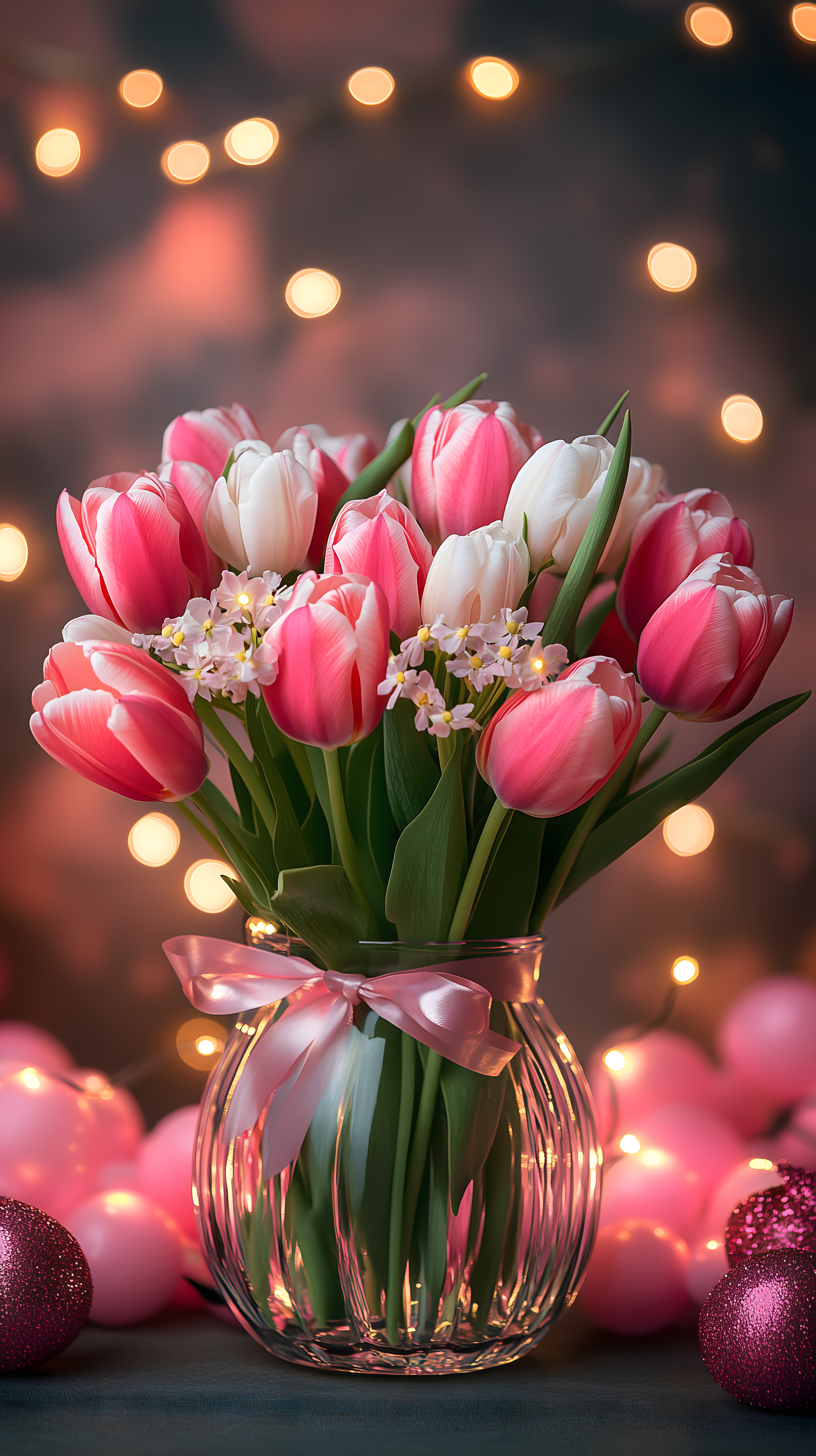 Das Foto zeigt einen eleganten Strauß aus rosa und weißen Tulpen, die in einer klaren Glasvase angeordnet sind. Die Vase ist mit einer rosa Schleife verziert, und um sie herum befinden sich einige glänzende rote Weihnachtskugeln, die das Foto mit einem festlichen Flair umgeben. Der Hintergrund ist unscharf gehalten, wodurch der Fokus ganz auf den Blumenstrauß gelenkt wird. Dieses Bild wäre ideal für die Verwendung in Blogs, Newslettern, Social-Media-Beiträgen oder Werbematerialien, insbesondere rund um Feiertage wie Weihnachten, Muttertag oder Valentinstag. Es ist ein kostenloses Stockfoto in hoher Auflösung und unter einer Creative-Commons-Lizenz verfügbar.