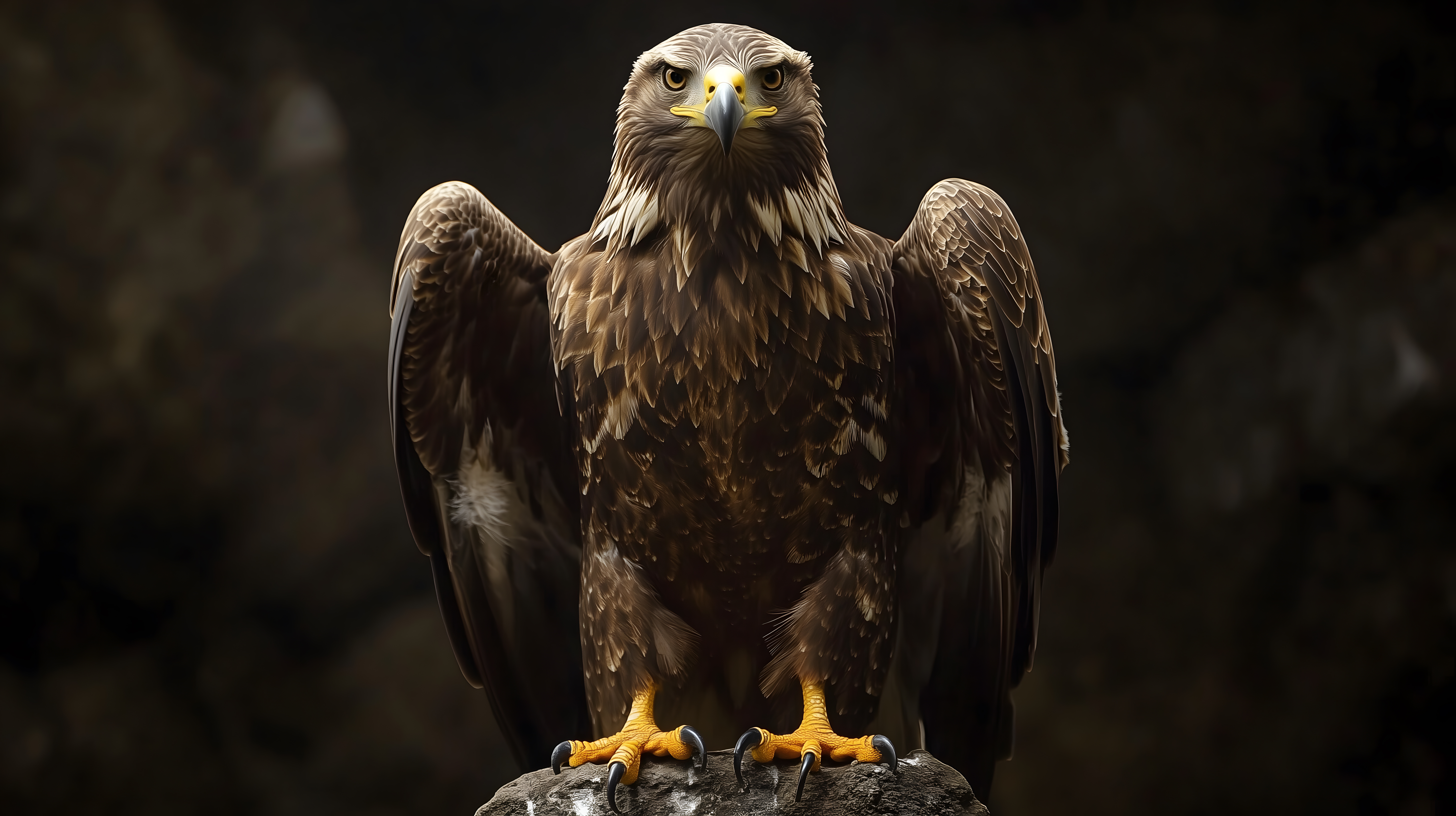 Das Bild zeigt einen mächtigen Seeadler mit ausgebreiteten Flügeln vor einem düsteren, dunklen Hintergrund. Der Adler sitzt auf einem Felsen und blickt entschlossen in die Kamera. Sein braun-schwarzes Gefieder und die gelben Augen verleihen ihm ein bedrohliches Erscheinungsbild. Dieses eindrucksvolle Foto eignet sich hervorragend für den Einsatz in Blogs, Newslettern, sozialen Medien oder als Werbemotiv, um Stärke, Dominanz und Wildnis zu vermitteln. Es ist ein kostenloses Stockfoto in hoher Auflösung, das unter Creative-Commons-Lizenz verwendet werden kann.