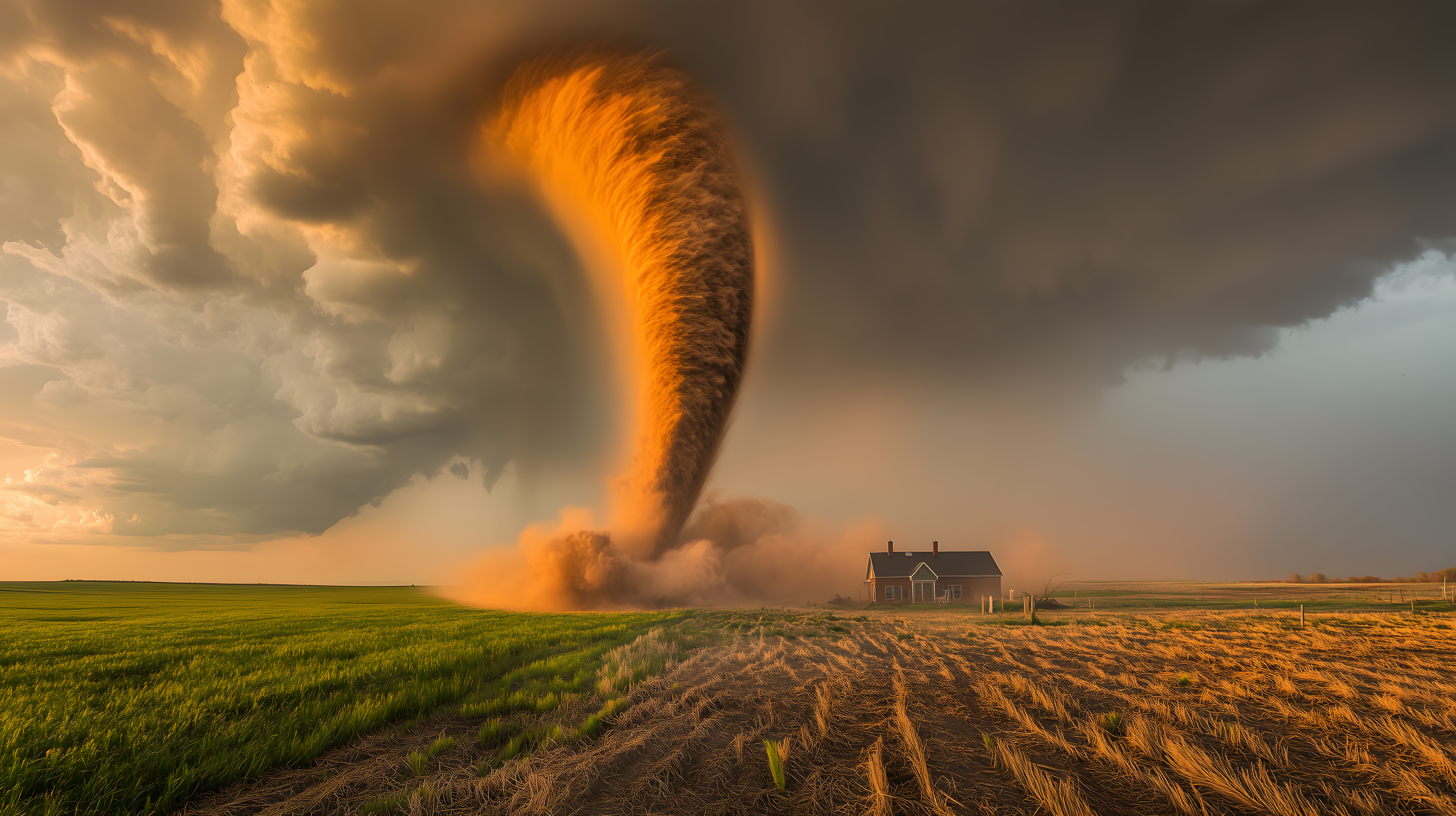 Dieses dramatische Foto zeigt einen gewaltigen Tornado, der über eine ländliche Landschaft mit einem Bauernhaus und Ackerfeldern hinwegfegt. Die Szene ist geprägt von bedrohlich dunklen Wolken am Himmel, die einen dramatischen Kontrast zu den orangerot gefärbten Sonnenstrahlen am Horizont bilden. Die Windböen des Tornados wirbeln Staub und Erde auf, was die Intensität der Naturgewalt eindrucksvoll unterstreicht. Dieses Stockfoto eignet sich hervorragend für Blogs, Newsletter oder Social-Media-Beiträge, die sich mit Themen wie Wetter, Naturkatastrophen oder dramatischer Landschaftsfotografie befassen. Das Bild ist in hoher Auflösung verfügbar und steht unter einer Creative-Commons-Lizenz zur Verfügung.