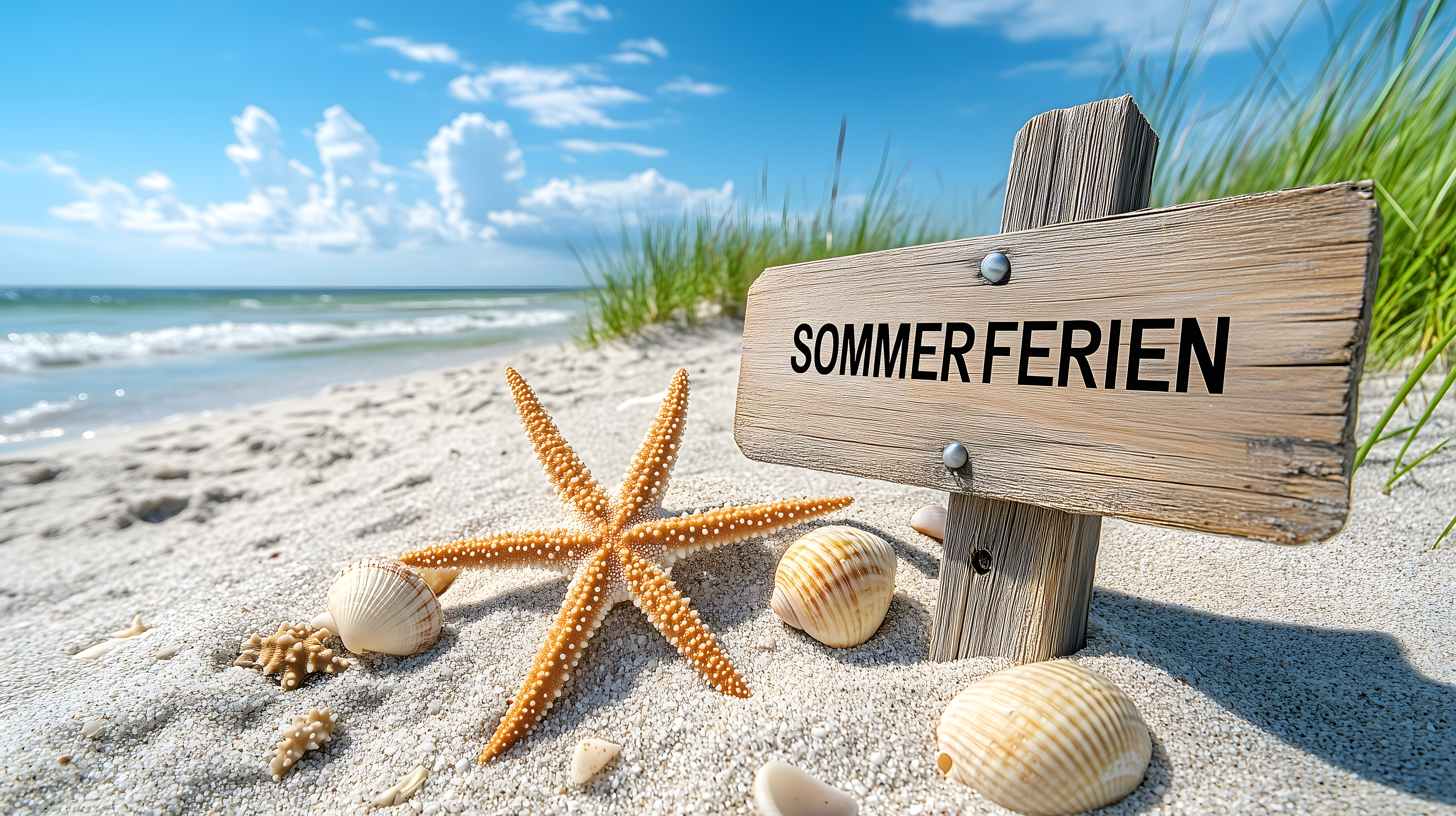 Dieses Foto zeigt eine idyllische Sommerlandschaft am Strand. Im Vordergrund ist ein Holzschild mit der Aufschrift 'Sommerferien' zu sehen, umgeben von Seesternen und Muscheln, die auf dem sand liegen. Im Hintergrund erkennt man den Horizont mit blauem Himmel und einigen Wolken. Das Bild vermittelt eine entspannende und erholsame Urlaubsstimmung und eignet sich perfekt für den Einsatz in Blogs, Newslettern, auf Social-Media-Kanälen oder in Werbekampagnen rund um das Thema Sommerurlaub und Reisen. Das hochauflösende Foto ist unter einer kostenlosen Creative-Commons-Lizenz verfügbar.