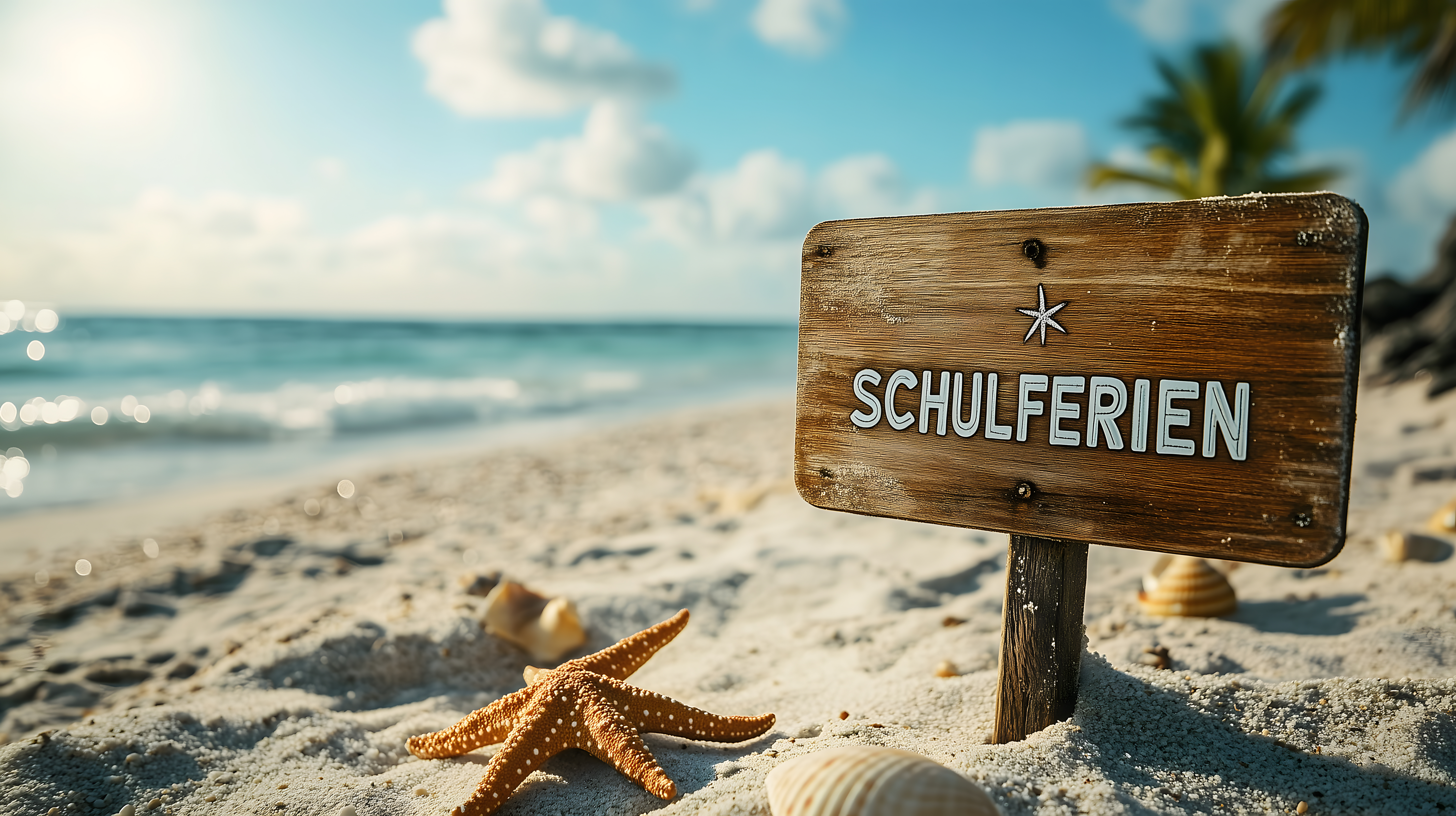 Das Bild zeigt einen idyllischen Sommerstrand mit einem hölzernen Hinweisschild, auf dem 'Schulferien' geschrieben steht. Im Vordergrund sind Seesterne und Muscheln im weichen Sand zu sehen, während im Hintergrund der blaue Himmel mit Wolken und Palmenblätter zu erkennen sind. Diese friedliche Strandszene vermittelt eine Atmosphäre der Entspannung und Urlaubsfreude und eignet sich hervorragend als kostenloses Stockfoto für Reise-, Urlaubs- oder Sommergestaltungen auf Blogs, in Newslettern, auf Social-Media-Kanälen oder in Werbekampagnen. Das hochauflösende Bild unter einer Creative-Commons-Lizenz kann frei genutzt werden.
