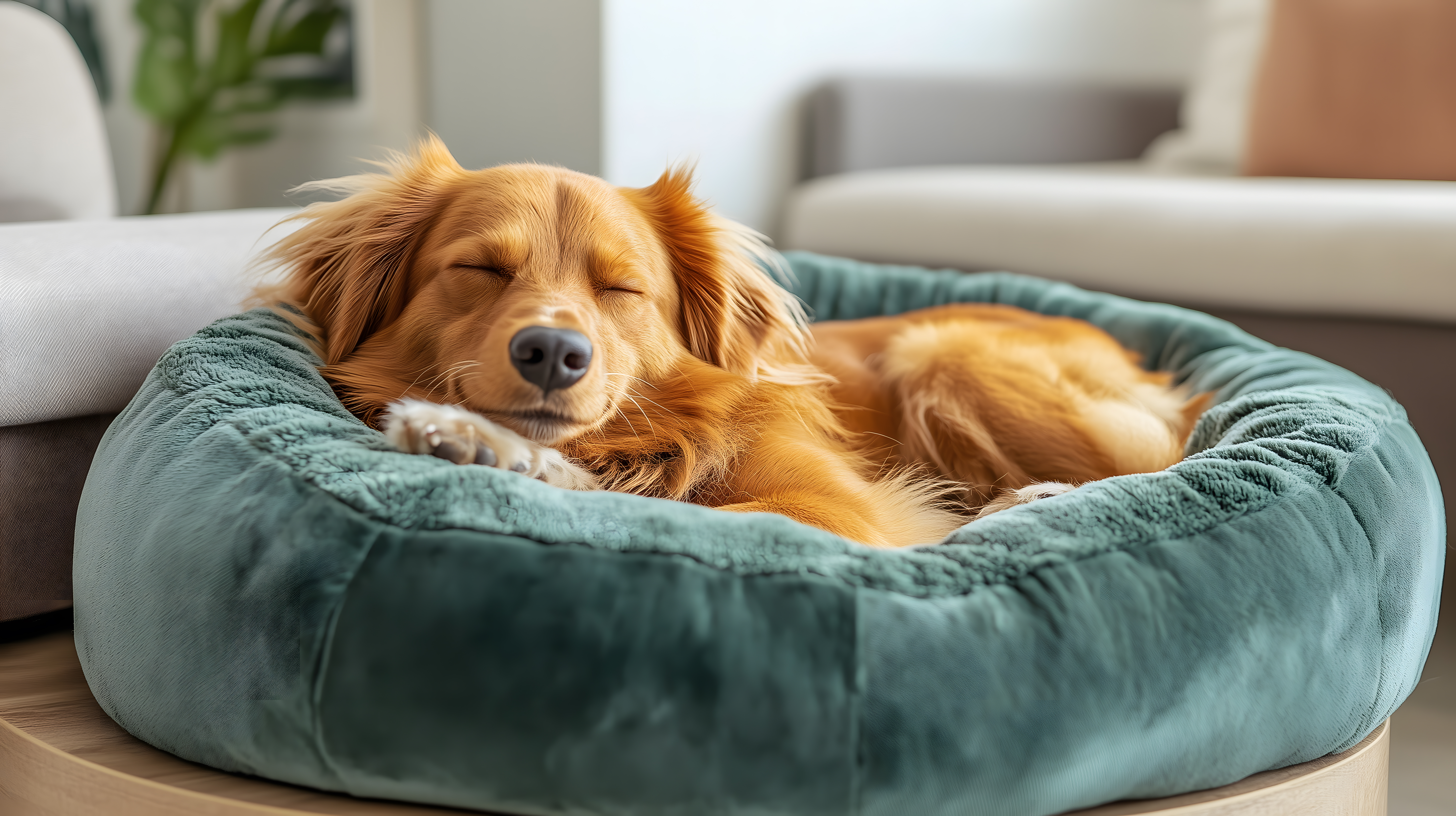 Das Bild zeigt einen entspannt schlafenden Golden Retriever Hund, der es sich in einem gemütlichen, weichen Hundebett mit grünem Futter bequem gemacht hat. Der Hund hat die Augen geschlossen und genießt sichtlich seine Auszeit. Dieses friedvolle, stimmungsvolle Foto eignet sich hervorragend als kostenfreies Stockfoto für Blogbeiträge, Newsletter oder soziale Medien rund um die Themen Haustiere, Tierfotografie oder Gemütlichkeit. Das hochauflösende Bild ist unter einer Creative Commons-Lizenz frei verwendbar.