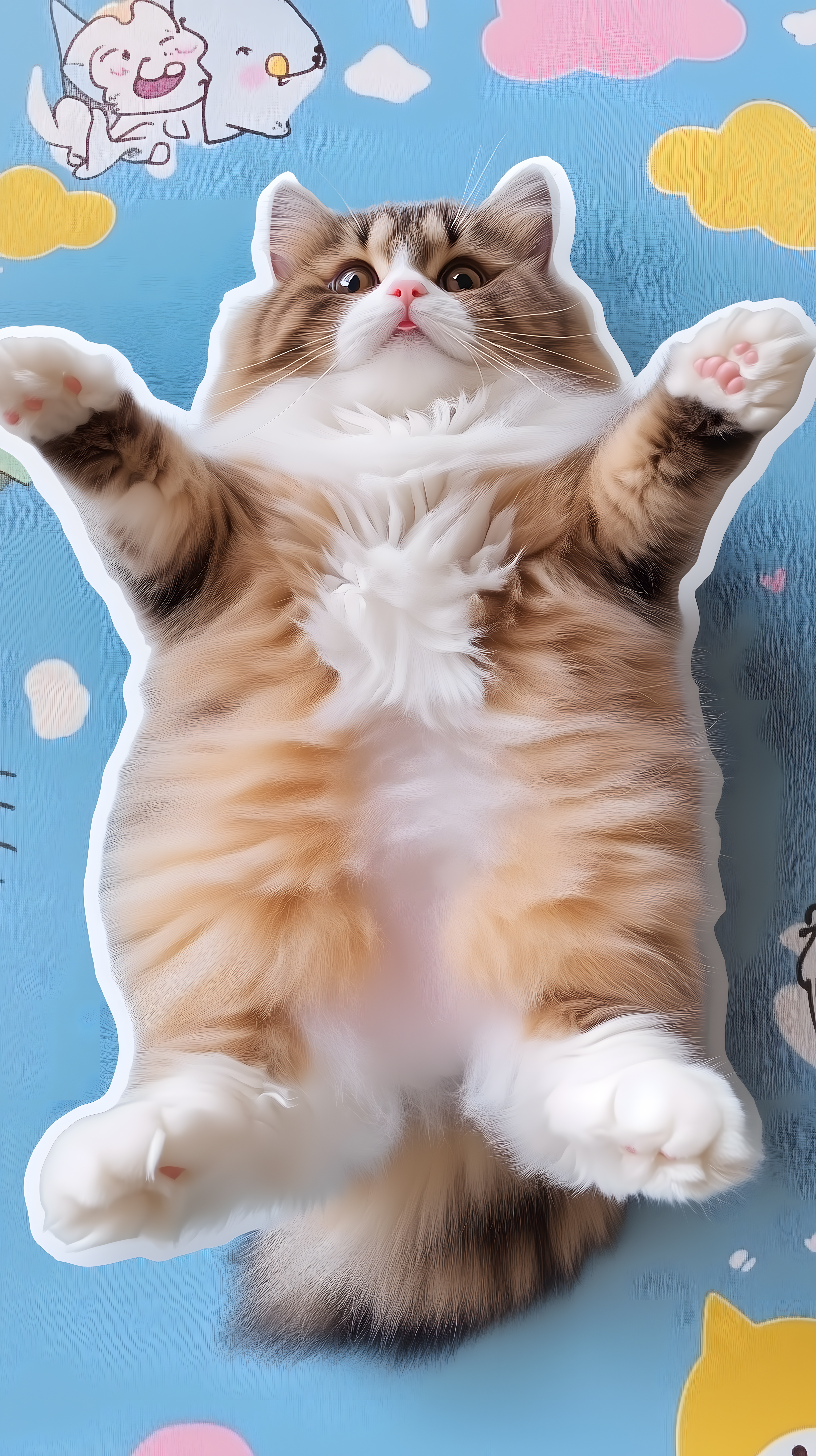 Dieses charmante Foto zeigt eine unglaublich flauschige und süße Katze, die sich wie ein Sticker auf einem blauen Hintergrund mit bunten Wolken und Herzen präsentiert. Die Katze hat ein helles, geschecktes Fell und einen fröhlichen, neugierigen Ausdruck. Das Foto besticht durch seine lebendige Farbgebung und die detailreiche Darstellung des Tieres. Es eignet sich hervorragend als kostenloses Stockfoto für den Einsatz in Blogs, Newslettern, auf Social-Media-Kanälen oder in Werbematerialien. Das hochauflösende Bild steht unter einer Creative-Commons-Lizenz zur Verfügung und kann vielfältig genutzt werden.