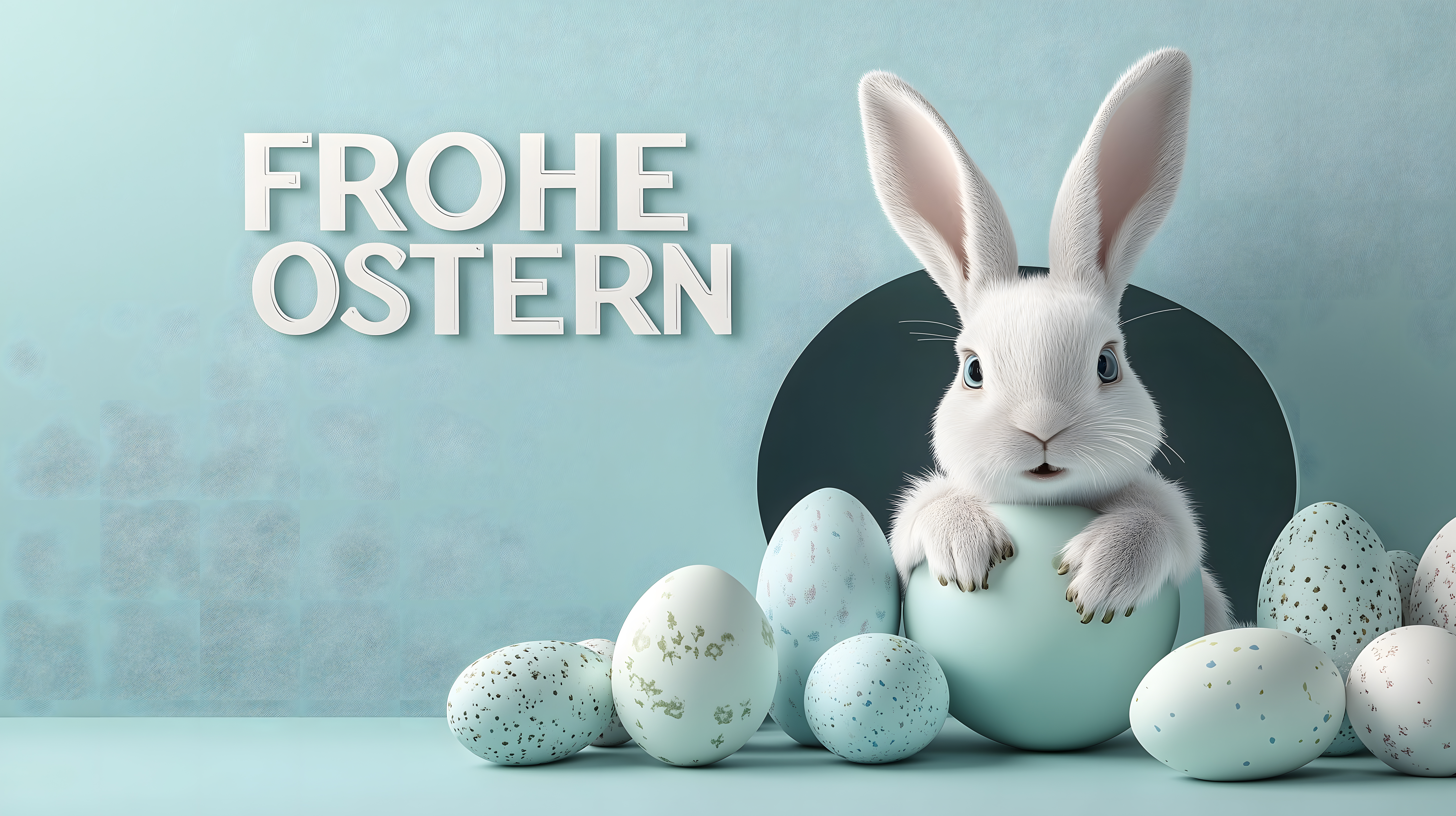 Das Bild zeigt einen niedlichen Osterhasen, der aus einem blauen Ei hervorzukommen scheint. Um ihn herum sind verschiedene pastellfarbene Ostereier in unterschiedlichen Blautönen angeordnet. Der frisch gebackene Osterhase blickt den Betrachter mit großen Augen und spitzen Ohren direkt an. Die Komposition ist symmetrisch und die Farben in sanften Grün- und Blautönen gehalten, was eine ruhige und friedliche Stimmung vermittelt. Dieses Stockfoto ist ideal für den Einsatz in Blogbeiträgen, Newslettern, Social-Media-Postings oder Werbematerialien rund um das Osterfest. Es steht in hoher Auflösung und unter einer Creative-Commons-Lizenz kostenlos zur Verfügung.