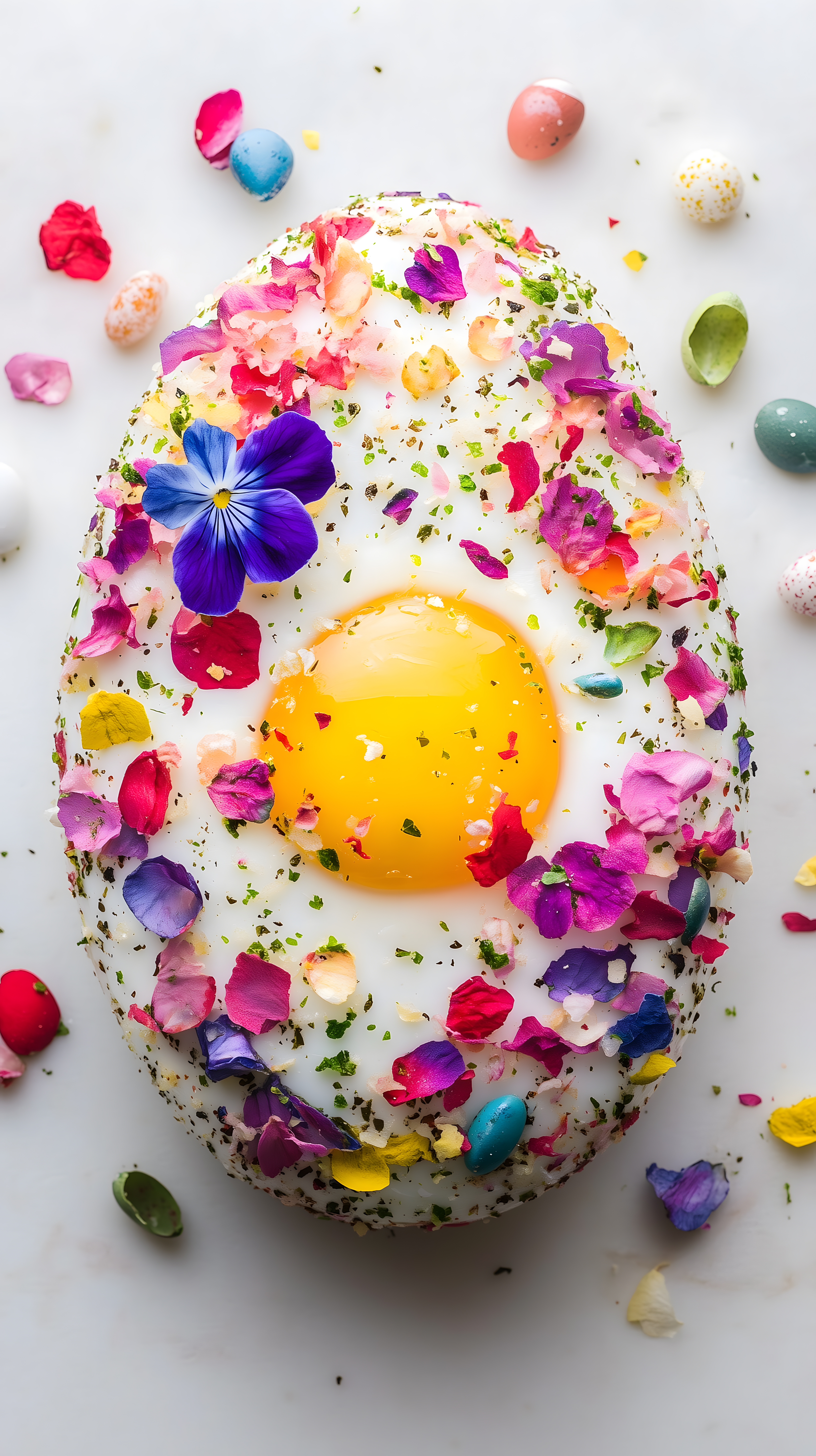 Das Bild zeigt ein liebevoll dekoriertes Osterei, das mit bunten Blüten, Kräutern und anderen natürlichen Elementen umrahmt ist. Der Fokus liegt auf dem goldgelben, von Blütenblättern umgebenen Hauptmotiv, das vor einem hellen, neutralen Hintergrund platziert ist. Die Komposition ist ausgewogen und farblich stimmig, was eine ästhetisch ansprechende, appetitliche Wirkung erzeugt. Dieses Foto eignet sich hervorragend für Ostern-, Frühlings- oder Lebensmittelbeiträge in Blogs, Newslettern oder sozialen Medien. Es ist ein hochwertiges, kostenloses Stockfoto, das unter der Creative-Commons-Lizenz zur Verfügung steht.