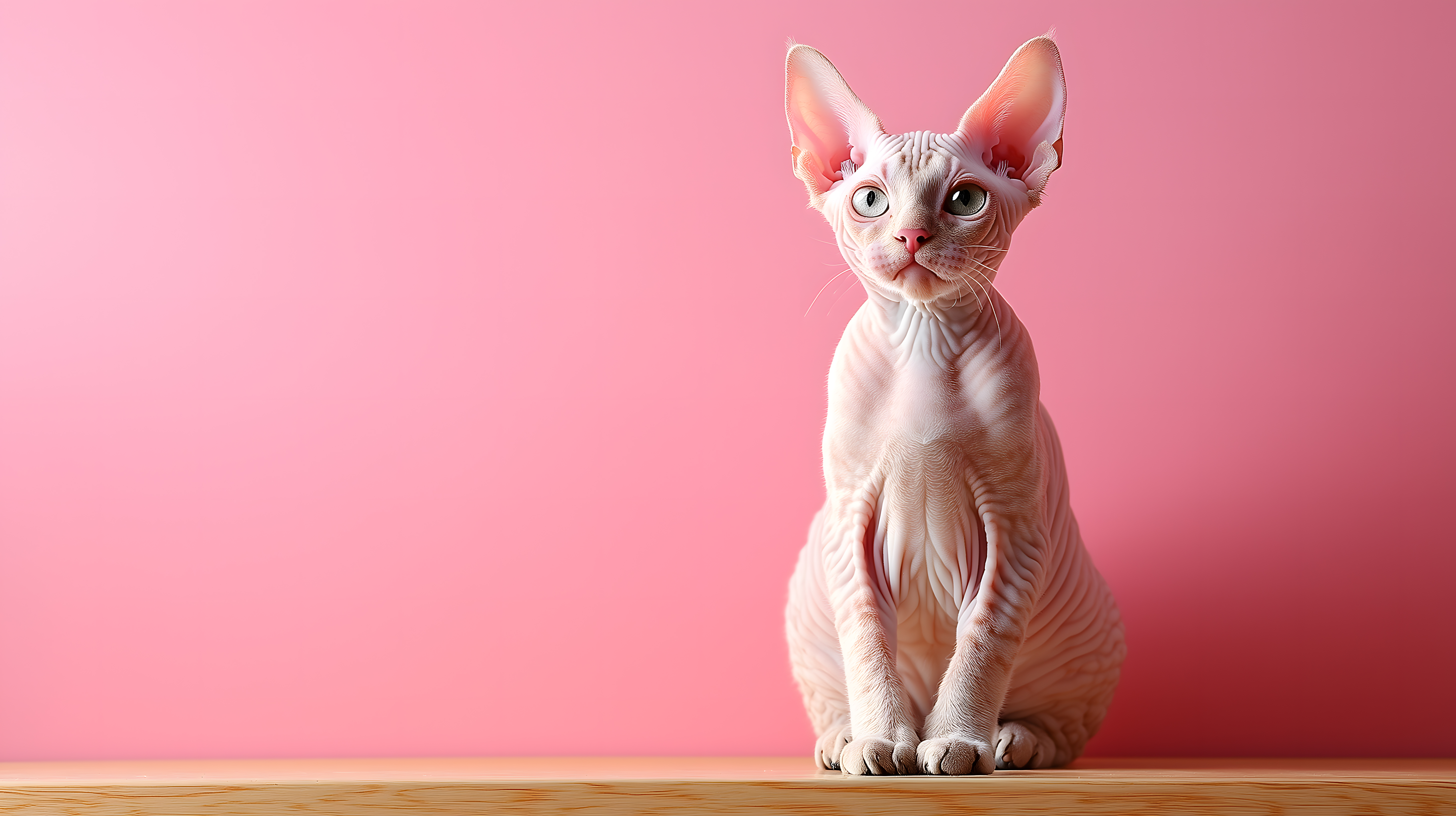 Das Bild zeigt eine Nahaufnahme einer Nacktkatze der Rasse Cornish Rex vor einem rosa Hintergrund. Die Katze sitzt aufrecht und blickt direkt in die Kamera. Ihr auffallend großes Ohr und die schlanke, muskulöse Figur sind deutlich zu erkennen. Das kräftige rosa des Hintergrunds lässt die weiße Fellfarbe der Katze besonders gut zur Geltung kommen. Dieses einzigartige Stockfoto in hoher Auflösung eignet sich hervorragend für Blogartikel, Newsletter-Gestaltung oder Social-Media-Posts rund um Katzen, exotische Haustierrassen oder Tierfotografie. Es steht unter einer Creative-Commons-Lizenz kostenfrei zum Download zur Verfügung.