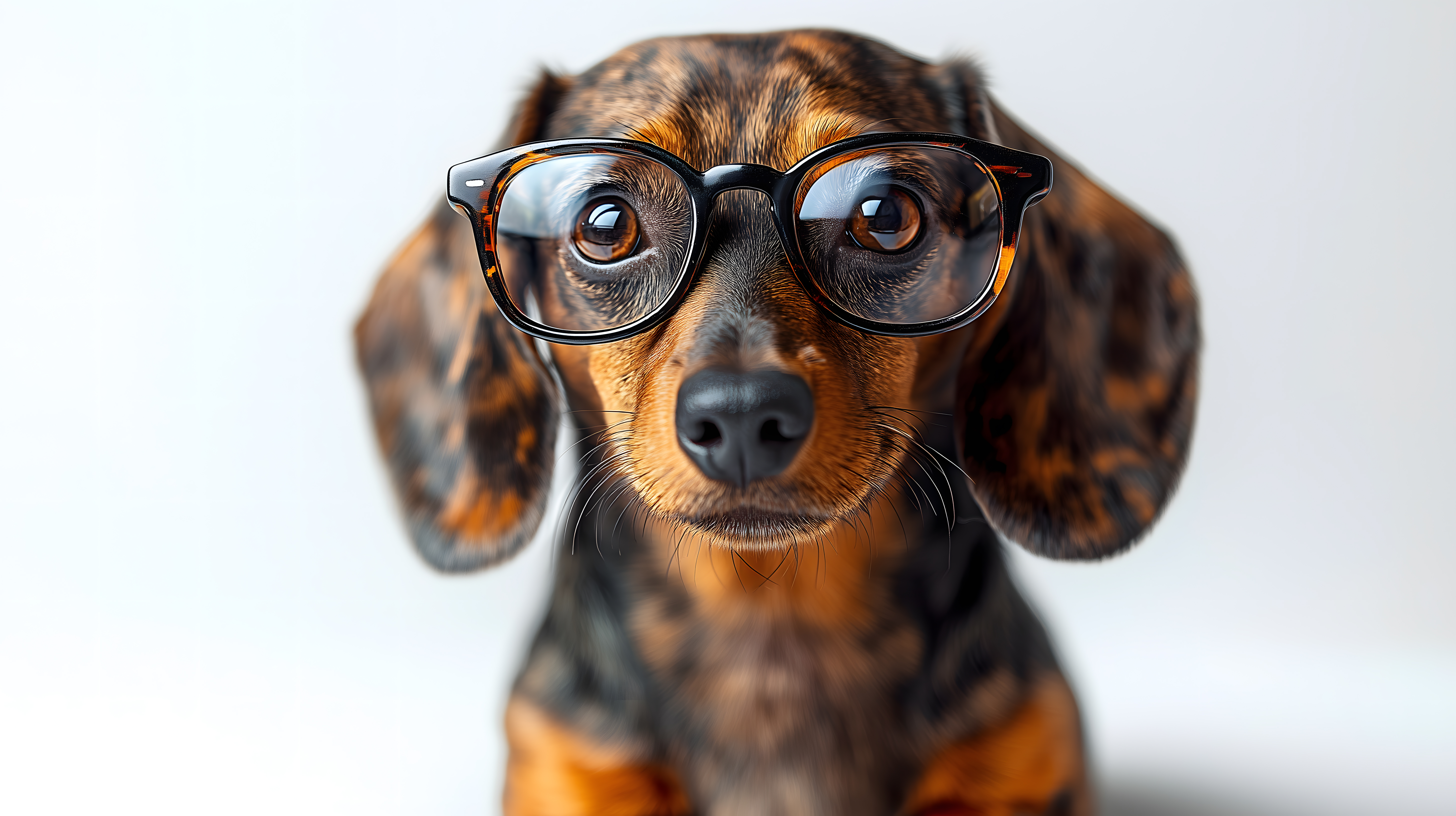 Das Bild zeigt einen entzückenden Dackel, der eine übergroße Nerdbrille trägt. Das Gesicht des Hundes nimmt den Großteil des Bildes ein, was den Fokus auf seinen liebevollen Blick und die ungewöhnliche Brille lenkt. Die Aufnahme hat eine saubere, minimalistische Ästhetik mit einem weißen Hintergrund, der die Aufmerksamkeit ganz auf den Hund lenkt. Dieses Stockfoto eignet sich hervorragend für Beiträge in Blogs, Newsletter oder Social-Media-Posts, in denen es um Haustiere, Humor oder unerwartete Kombinationen geht. Das Bild ist in hoher Auflösung verfügbar und steht unter einer Creative-Commons-Lizenz zur Verfügung.