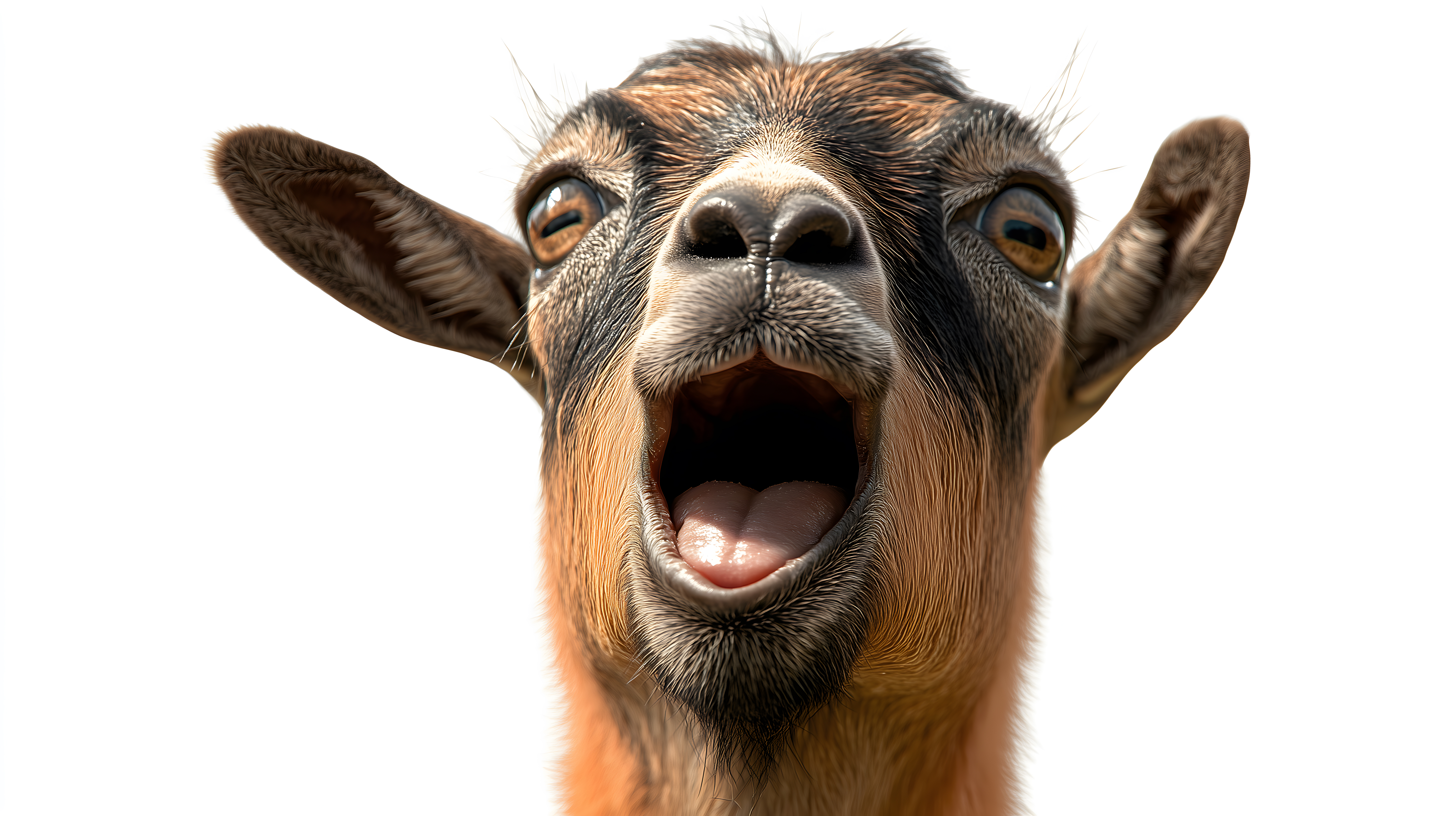 Dieses audrucksstarke Foto zeigt eine Nahaufnahme einer brüllenden Ziege vor einem weißen Hintergrund. Das Gesicht des Tieres nimmt den Großteil des Bildes ein, mit offenem Maul und nach oben gerichteten Ohren. Die Nähe zum Motiv und der klare Fokus lassen die Detailstrukturen des Fells und der Gesichtszüge deutlich hervortreten. Das Bild zeichnet sich durch einen hohen Kontrast und eine lebendige Farbpalette aus, die die Intensität des Moments eindrucksvoll einfangen. Dieses Hochauflösungsfoto eignet sich hervorragend als kostenloses Stockfoto für Blogs, Newsletter, Social-Media-Beiträge oder andere kreative Projekte unter der Creative-Commons-Lizenz.