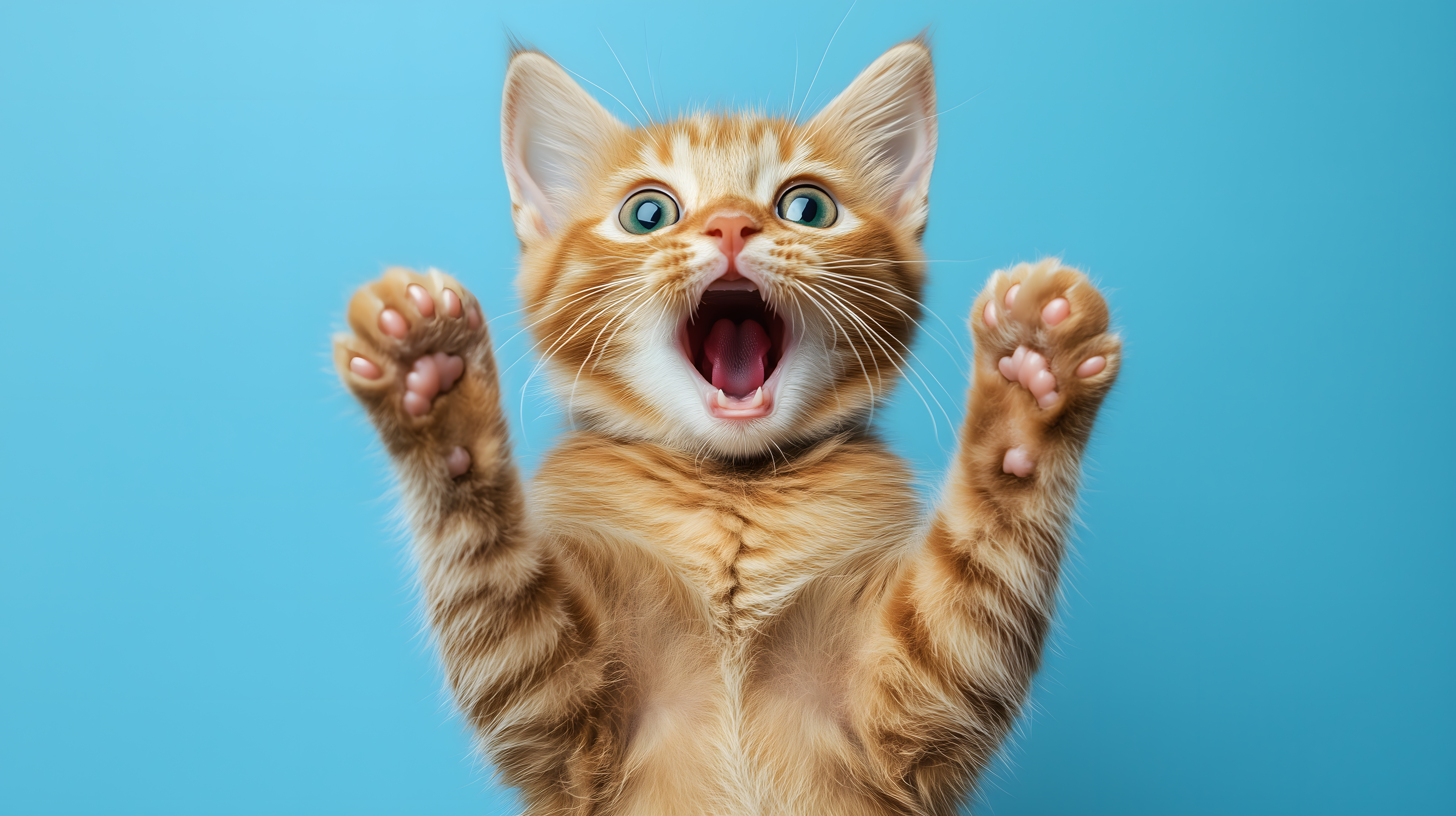 Das Bild zeigt ein aufgeregt miauendes Haustier-Kätzchen mit orangem Fell, das mit weit aufgerissenem Maul und erhobenen Pfoten vor einem einfarbig blauen Hintergrund fotografiert wurde. Das dynamische Bild fesselt den Betrachter durch die lebendige, ausdrucksstarke Mimik des Kätzchens. Das Foto eignet sich hervorragend als Hingucker für Blogs, Social-Media-Posts oder Newsletter zum Thema Haustiere, Tiere und Natur. Als hochauflösendes, kostenloses Stockfoto unter Creative-Commons-Lizenz ist es vielseitig einsetzbar.
