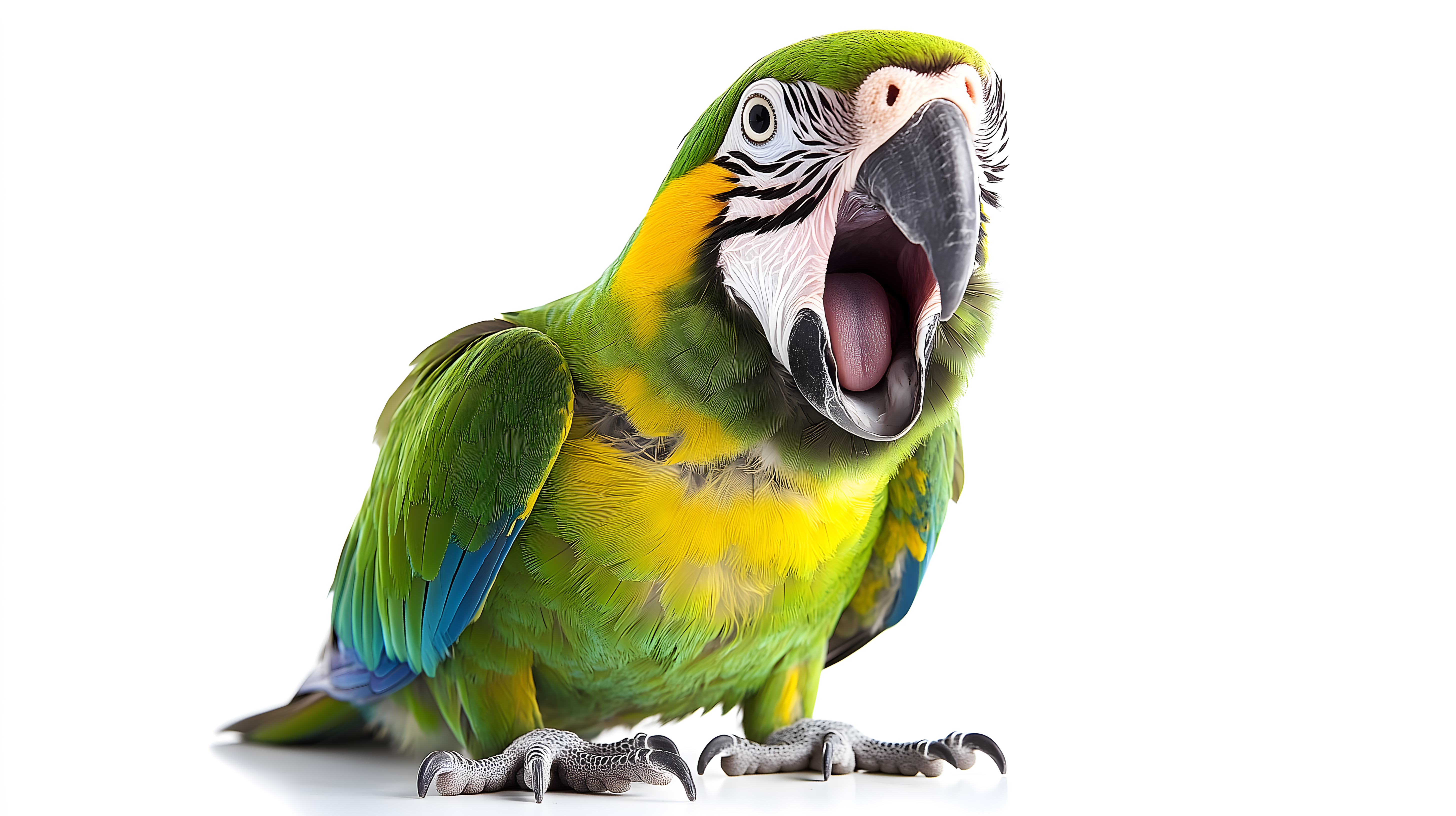 Dieses eindrucksvolle Foto zeigt einen schreienden grünen Papagei mit gelbem Gefieder vor weißem Hintergrund. Der Papagei hat seinen Schnabel weit aufgerissen und sieht sehr aufgeregt aus. Die lebendigen Farben und detailreiche Darstellung machen dieses Bild zu einem fantastischen Motiv für Werbung, Social Media oder Bloginhalte. Als hochwertiges, kostenloses Stockfoto in hoher Auflösung und unter der Creative Commons-Lizenz kann es vielfältig eingesetzt werden.