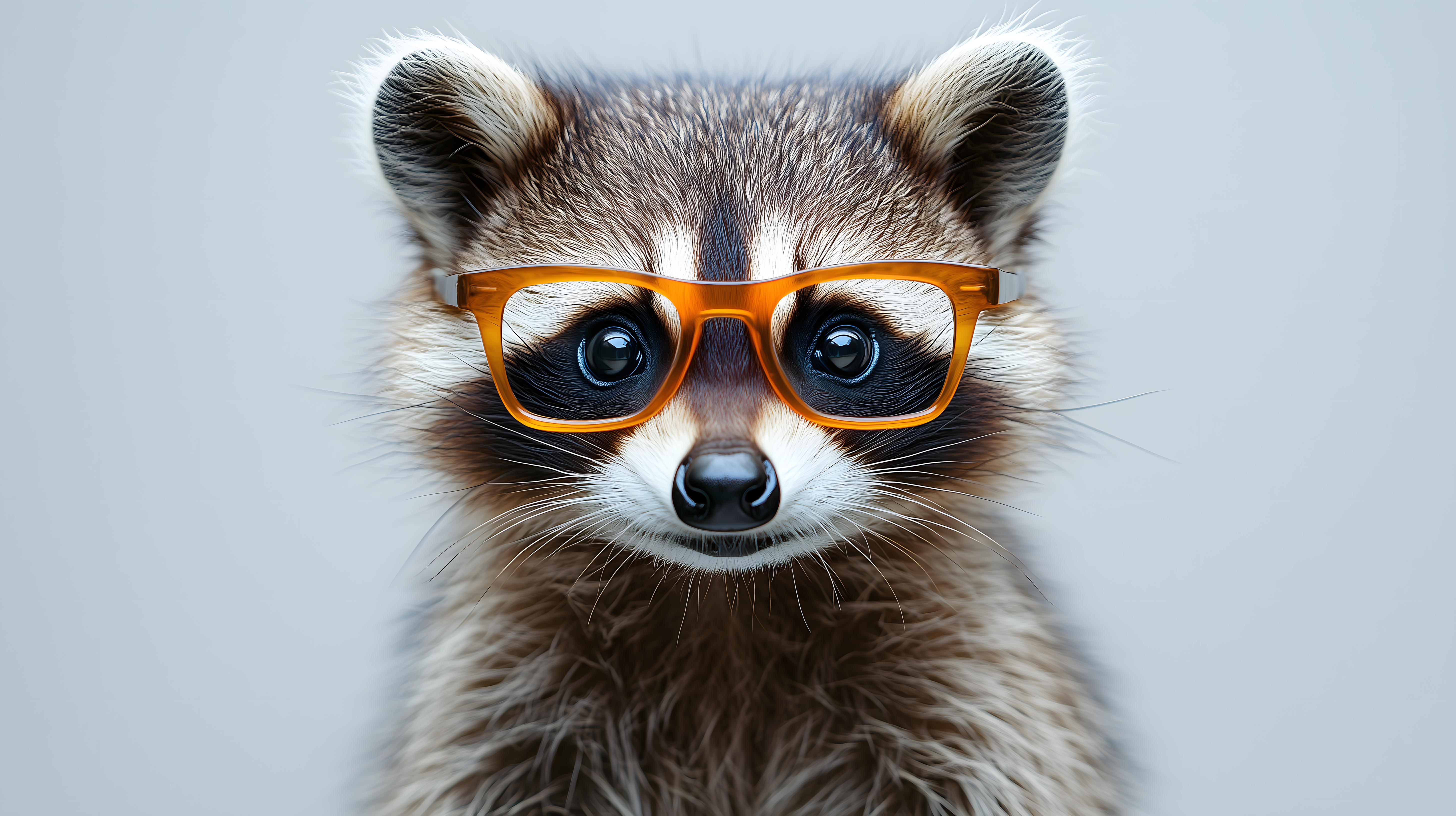 Dieses faszinierende Stockfoto zeigt einen detaillierten Nahaufnahme-Porträtschuss eines Waschbären, der eine auffällige, orangefarbene Brille trägt. Der Waschbär blickt direkt in die Kamera mit großen, neugierigen Augen, was einen charmanten und humorvollen Eindruck vermittelt. Der graue Hintergrund lenkt den Fokus komplett auf das Tier und seine ungewöhnliche Ausstattung. Dieses Foto eignet sich hervorragend für den Einsatz in kreativen Projekten wie Blogbeiträgen, Social-Media-Posts, Werbekampagnen oder Designarbeiten. Als hochauflösendes Stockfoto unter einer Creative-Commons-Lizenz ist es kostenlos für eine Vielzahl von kommerziellen und persönlichen Zwecken nutzbar.