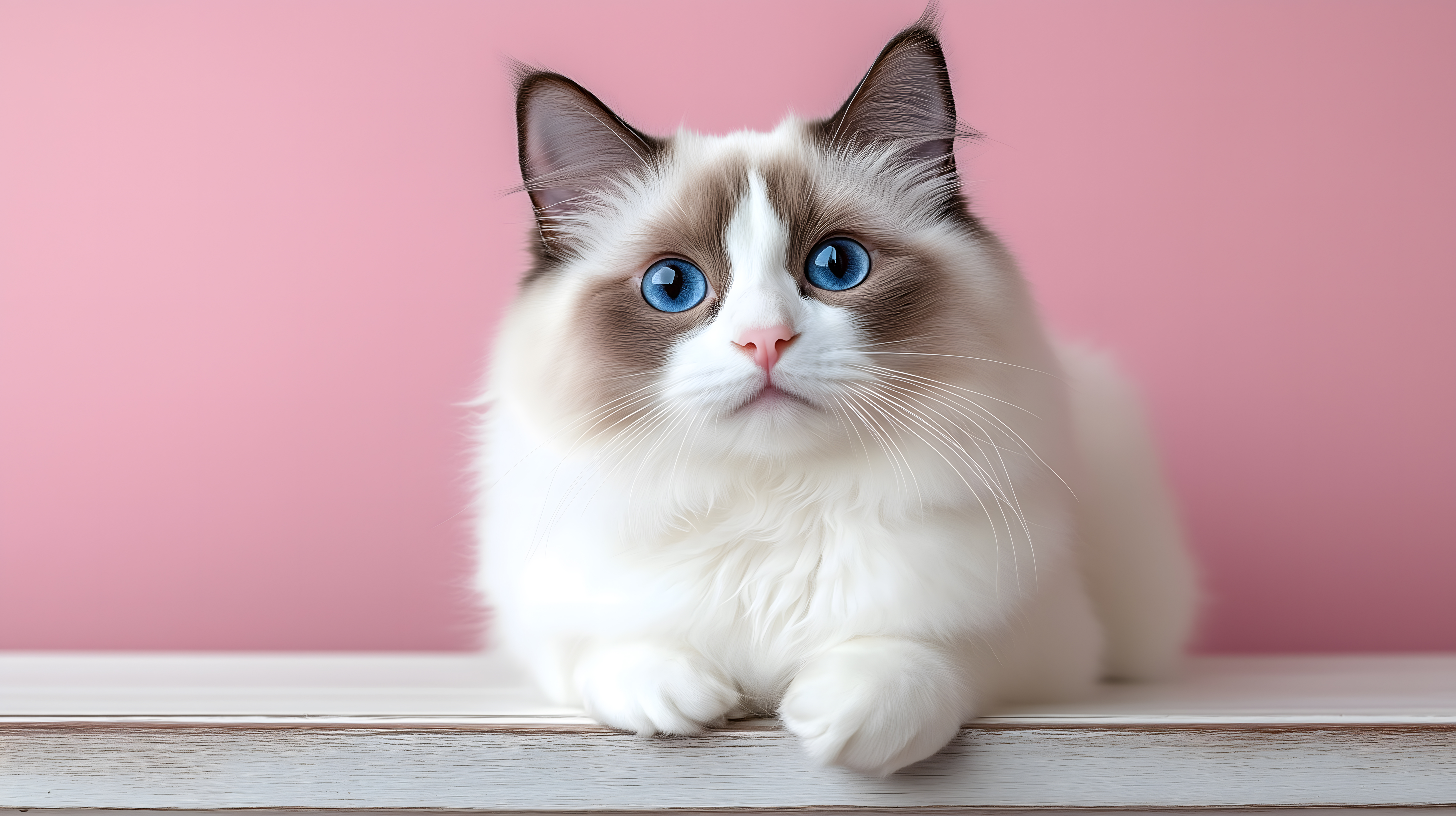Das Foto zeigt eine Ragdoll-Katze mit einem ruhigen, aufmerksamen Blick. Die Katze hat weiches, flauschiges Fell und strahlend blaue Augen, die vor einem sanften rosa Hintergrund in Szene gesetzt sind. Dieses hochwertige Stockfoto eignet sich hervorragend für den Einsatz in Blogs, Newslettern, Social-Media-Beiträgen oder Werbematerialien, bei denen süße Haustiere, sanfte Farben oder eine beruhigende Bildästhetik gefragt sind. Das Foto ist in hoher Auflösung verfügbar und steht unter einer Creative-Commons-Lizenz zum kostenlosen Download zur Verfügung.