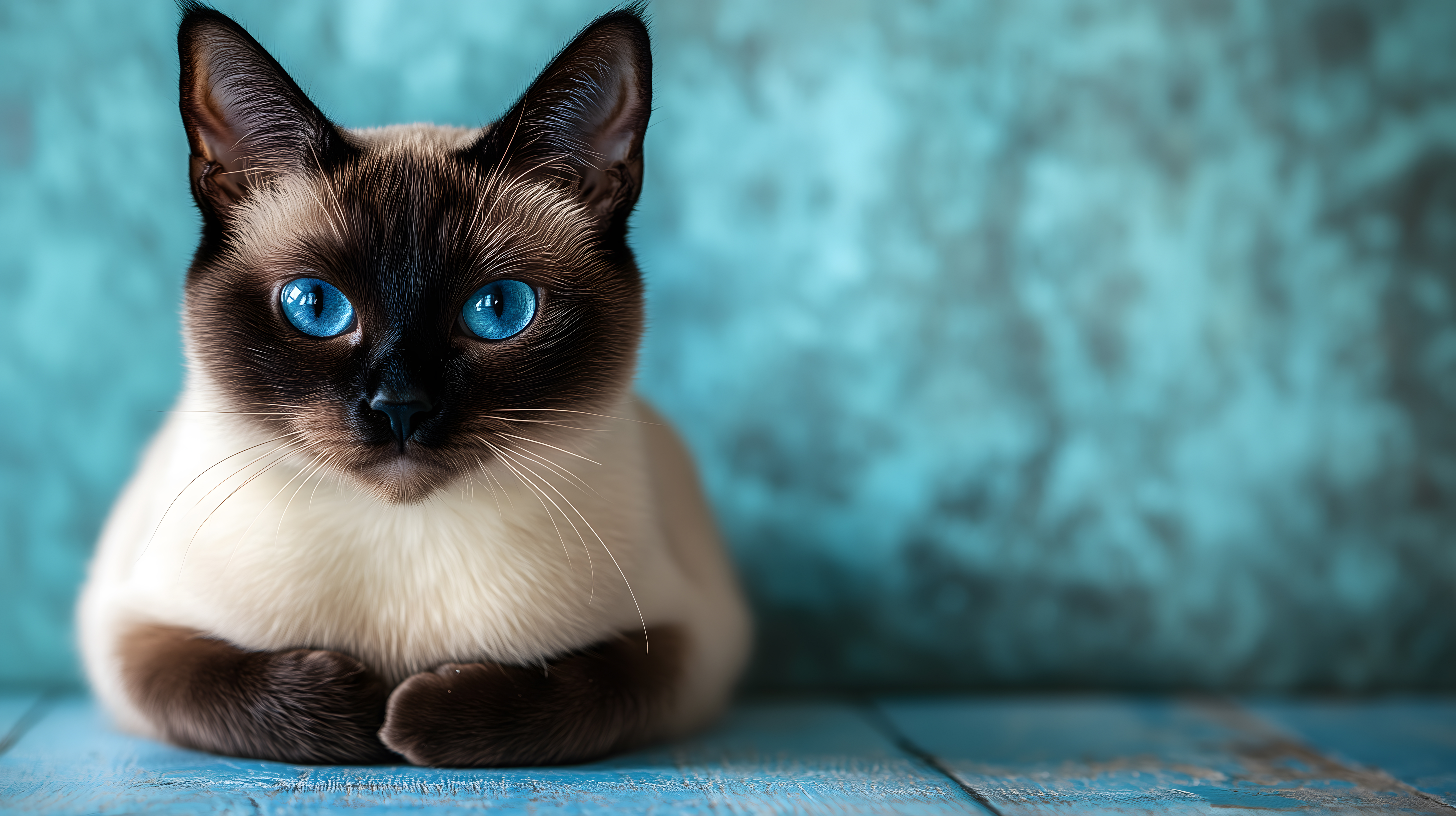 Dieses hochwertige Stockfoto zeigt eine elegante Siamesische Katze mit leuchtenden blauen Augen vor einem türkisfarbenen, unscharfen Hintergrund. Die Katze blickt direkt in die Kamera, was eine ruhige und friedliche Atmosphäre vermittelt. Mit ihrer perfekten Positionierung und dem klaren Fokus auf die Augen der Katze, ist dieses Foto ideal geeignet für den Einsatz in Blogs, Newslettern, sozialen Medien oder Werbematerialien. Es handelt sich um ein kostenloses Stockfoto in hoher Auflösung, das unter einer Creative Commons-Lizenz steht und somit vielfältig verwendet werden kann.