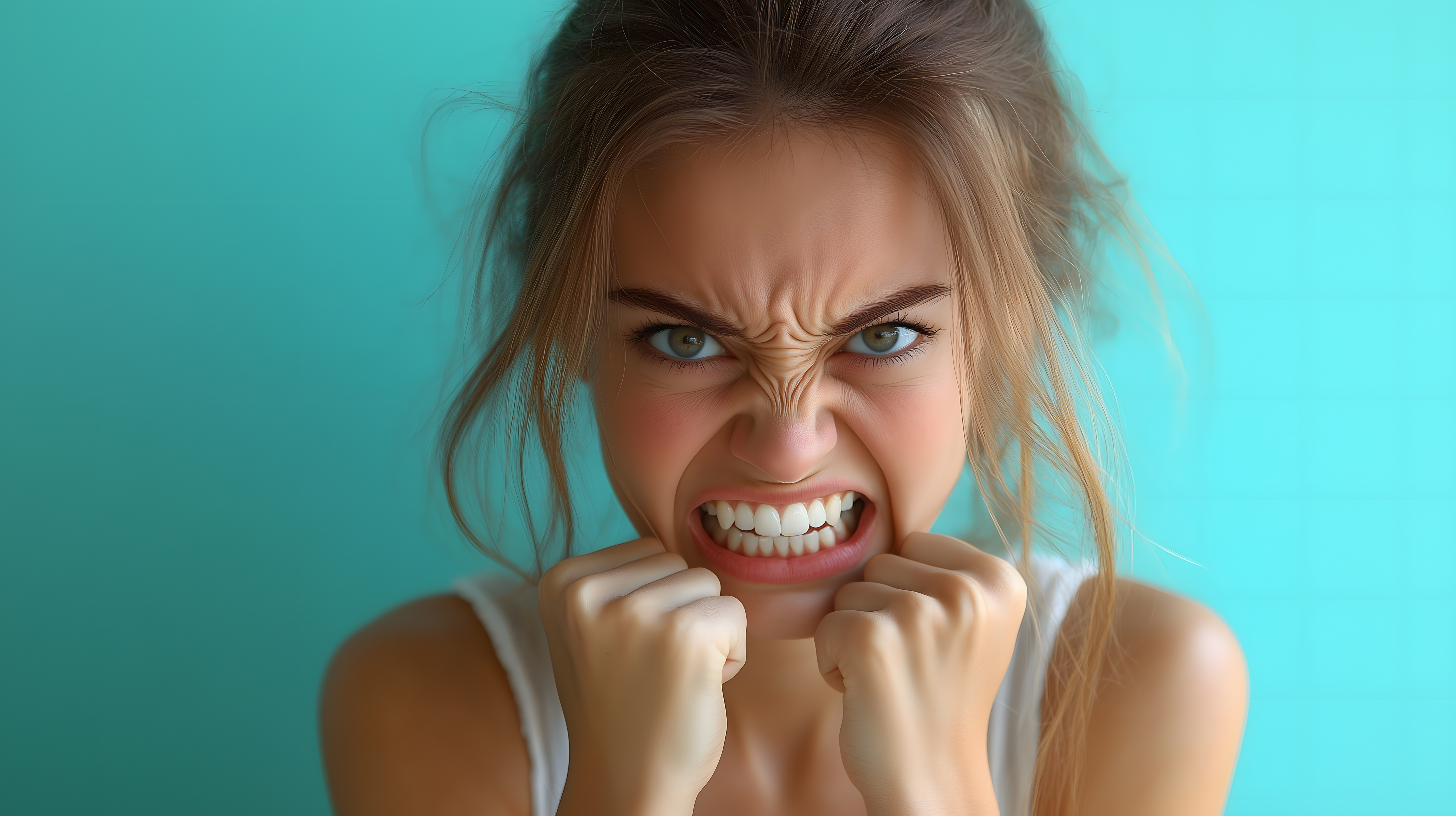 Das Foto zeigt eine Frau mit einem wütenden Gesichtsausdruck. Sie hat die Stirn gerunzelt, die Augen zusammengekniffen und die Zähne fest zusammengebissen. Ihre Hände sind zu Fäusten geballt, was den Eindruck von Aggression und Anspannung verstärkt. Der Hintergrund ist einfarbig in einem intensiven Türkiston, wodurch der Fokus ganz auf das Gesicht und die Mimik der Frau gelenkt wird.