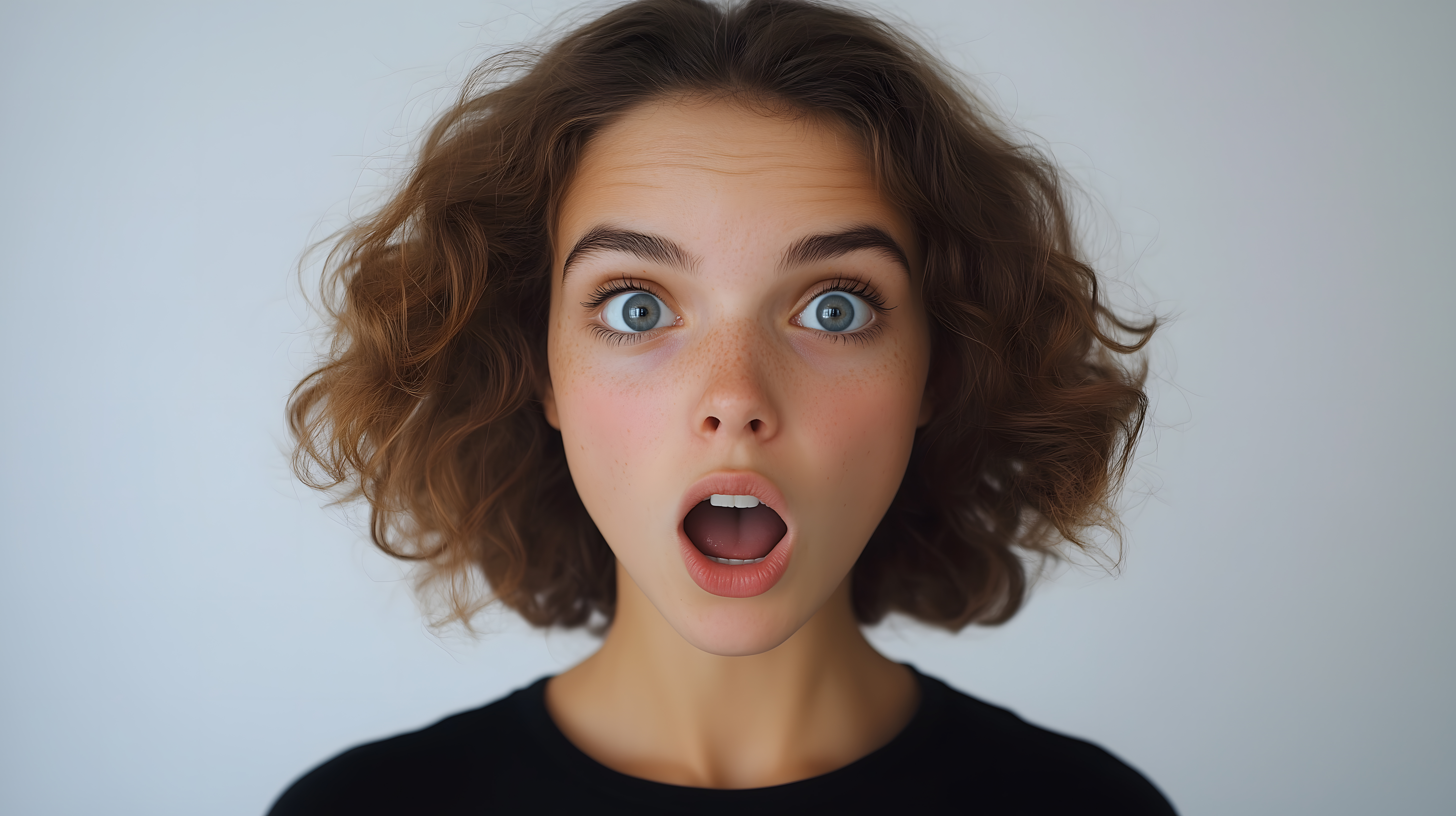 Das Foto zeigt eine junge Frau mit lockiger Frisur und großen, überraschten Augen. Ihr Mund ist leicht geöffnet, was einen erstaunten Gesichtsausdruck vermittelt. Die Nahaufnahme ihres Gesichts auf neutralem Hintergrund legt den Fokus ganz auf ihren Gesichtsausdruck und ihre Mimik. Dieses Stockfoto eignet sich hervorragend für die Verwendung in Blogs, Werbekampagnen oder Newslettern, in denen eine lebendige, emotionale Stimmung vermittelt werden soll. Das hochauflösende Bild steht unter einer Creative-Commons-Lizenz zur freien Nutzung zur Verfügung.
