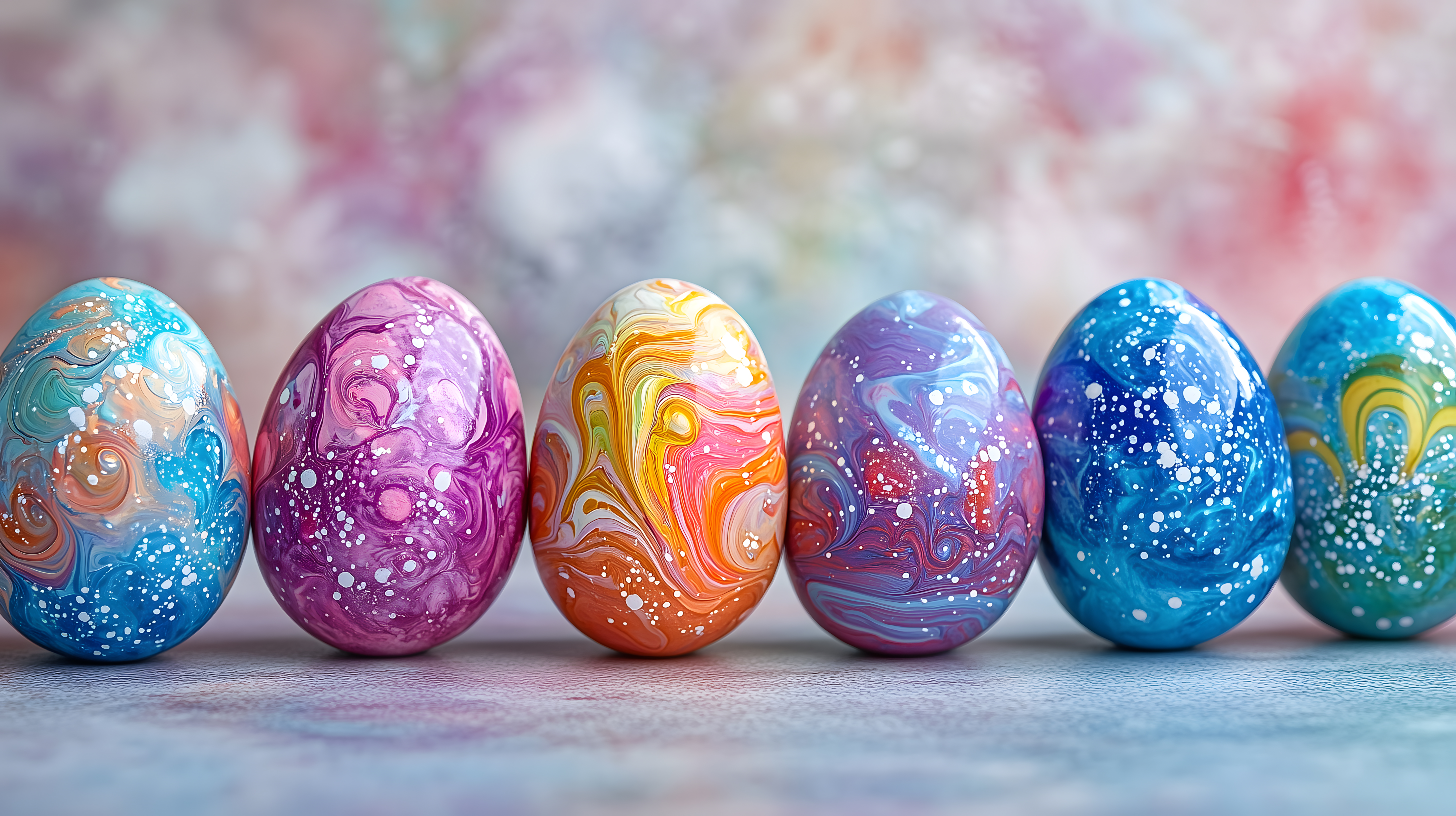 Dieses bunte und kreative Foto zeigt eine Reihe handbemalter Ostereier mit marmorierter Oberfläche. Die Eier sind in verschiedenen pastelligen Farbtönen gehalten - von Blau, Lila und Pink bis hin zu Orange und Gelb. Das einzigartige Muster der Eier verleiht ihnen ein modernes und künstlerisches Aussehen, das zum Feiern des Osterfestes perfekt geeignet ist.