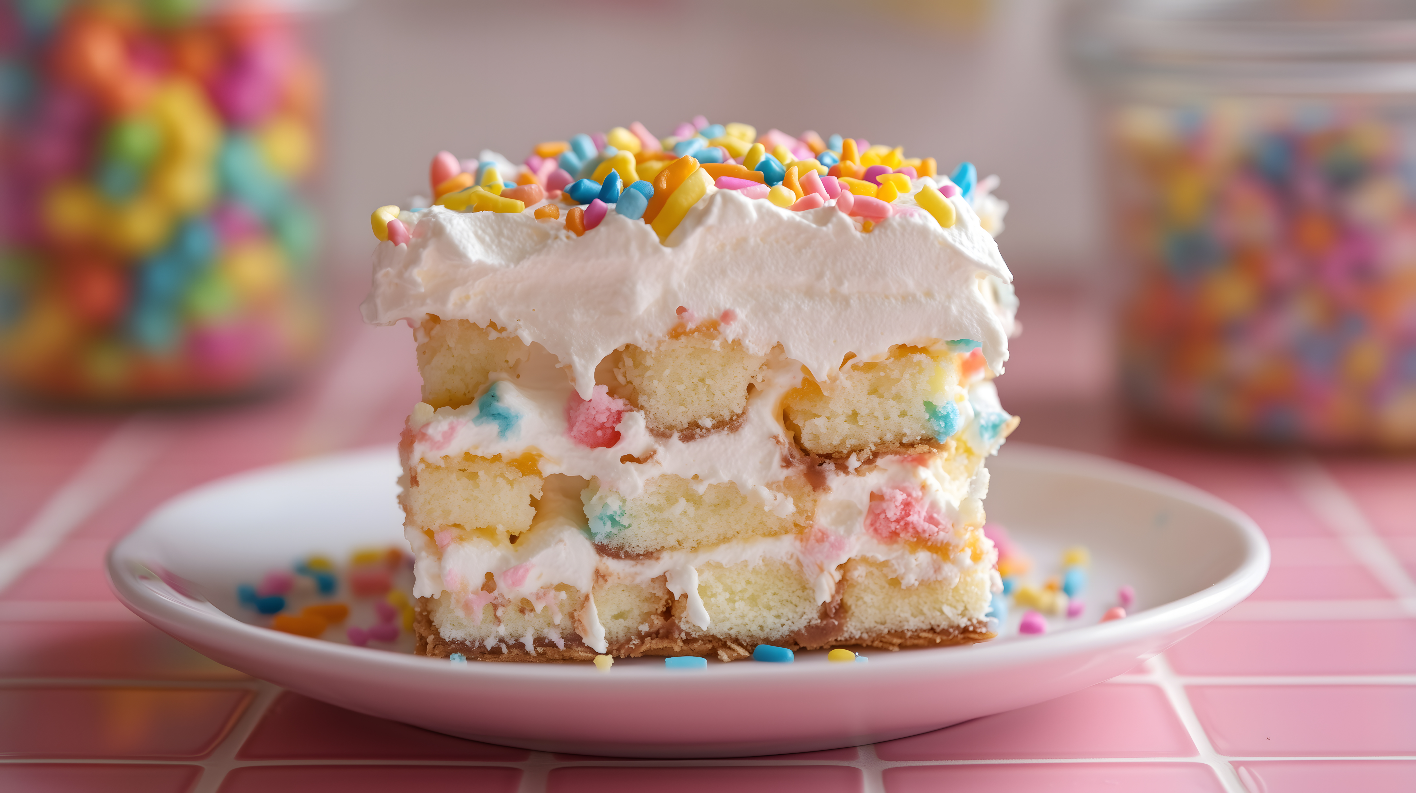 Dieses einzigartige Foto zeigt einen appetitlichen, mehrschichtigen Regenbogenkuchen, der mit einer cremigen Sahnehaube und bunten Streuseln dekoriert ist. Der Kuchen wurde auf einem pastellfarbenen Teller platziert, wodurch die leuchtenden Farben besonders gut zur Geltung kommen. Das Dessert strahlt eine fröhliche, festliche Atmosphäre aus und eignet sich hervorragend als Eyecatcher für Blogs, Newsletter, Social-Media-Posts oder Werbeanzeigen rund um das Thema Backen, Feiern und Süßspeisen. Dieses hochauflösende, kostenlose Stockfoto unter Creative-Commons-Lizenz kann vielfältig eingesetzt werden.