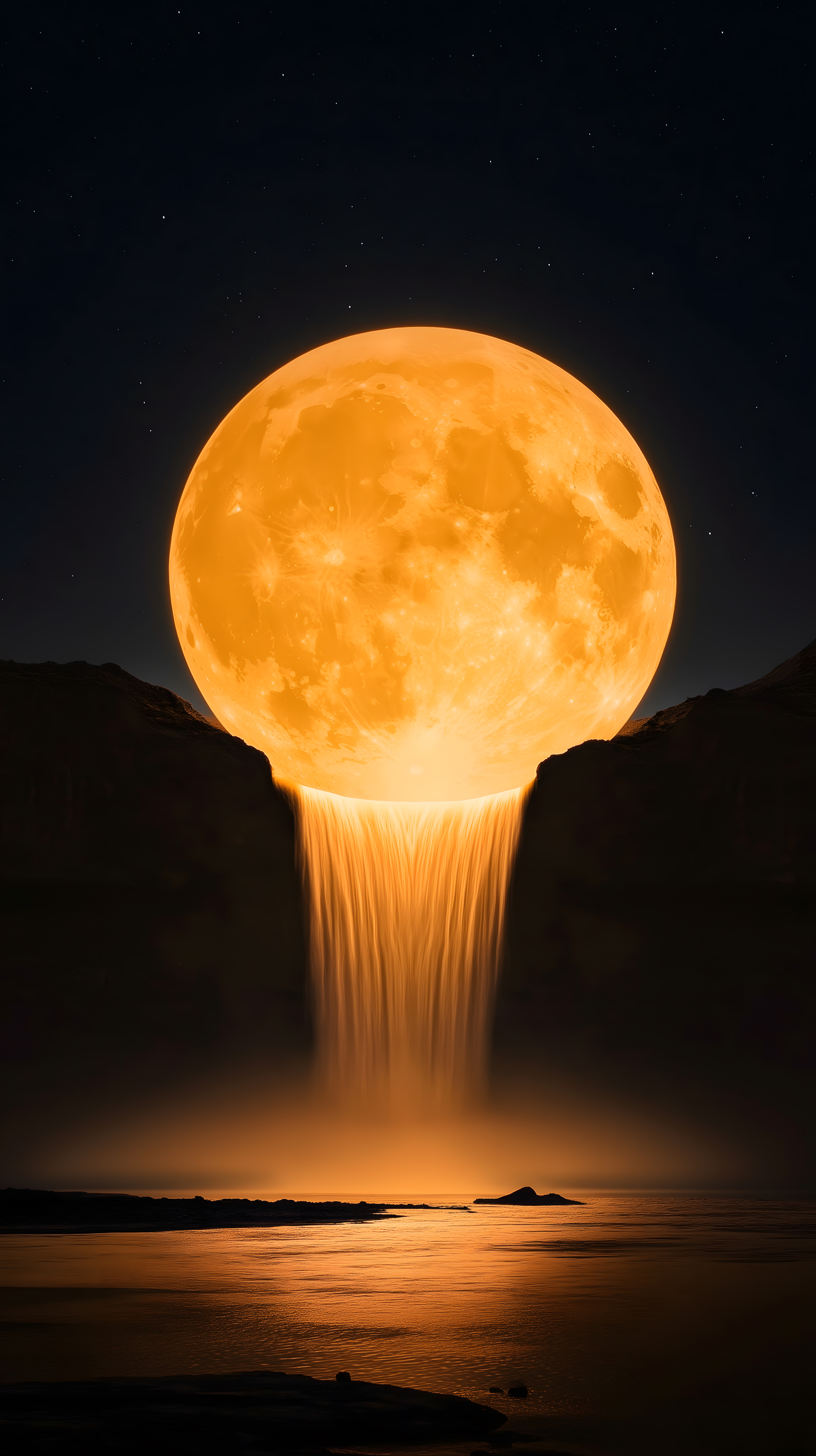 Das Bild zeigt eine surreale Landschaft bei Nacht, in der der Vollmond wie ein gigantischer Wasserfall über die Berge herabstürzt. Das warme, goldene Licht des Mondes spiegelt sich auf der Oberfläche des Wassers und verleiht der Szene eine fast märchenhafte Atmosphäre. Der klare Nachthimmel mit funkelnden Sternen bildet den perfekten Hintergrund für dieses fantastische Naturphänomen. Dieses kostenfreie Stockfoto in hoher Auflösung eignet sich hervorragend für Blogs, Newsletter, Soziale Medien oder Werbekampagnen, bei denen eine mystische, traumhafte Stimmung vermittelt werden soll. Die Veröffentlichung ist unter der Creative-Commons-Lizenz möglich.