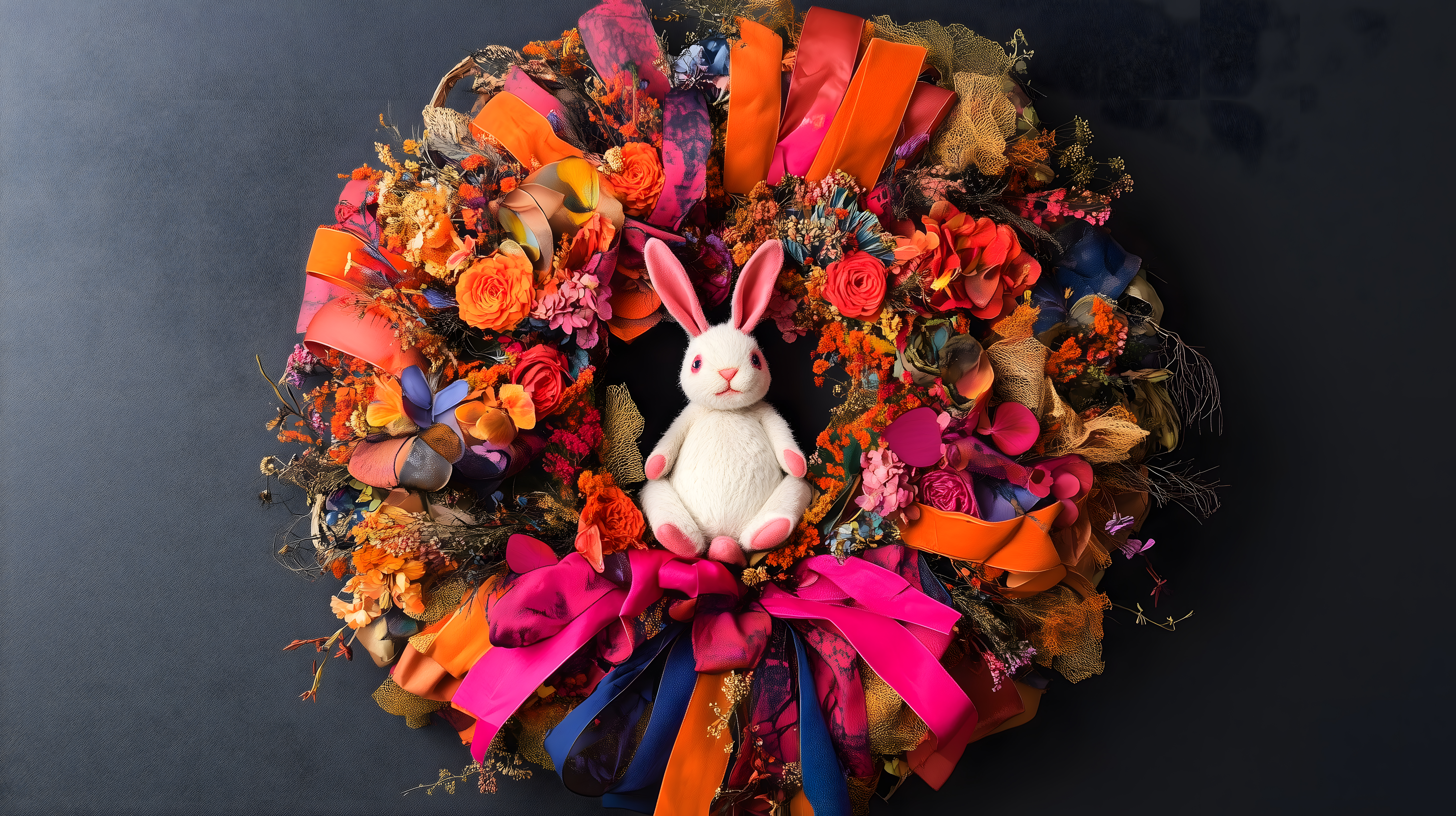Dieses farbenprächtige Foto zeigt einen prachtvollen Osterkranz, der aus einer Vielzahl von bunten Blumen und einer Hasenfigur komponiert ist. Der Kranz ist in einem stilvollen, dunklen Hintergrund inszeniert, wodurch die kräftigen Farben und Texturen besonders hervorgehoben werden. Die Komposition ist harmonisch und lädt den Betrachter ein, die detailreichen Elemente, wie die Rosen, Tulpen und den weichen Plüschhase, genauer zu betrachten.