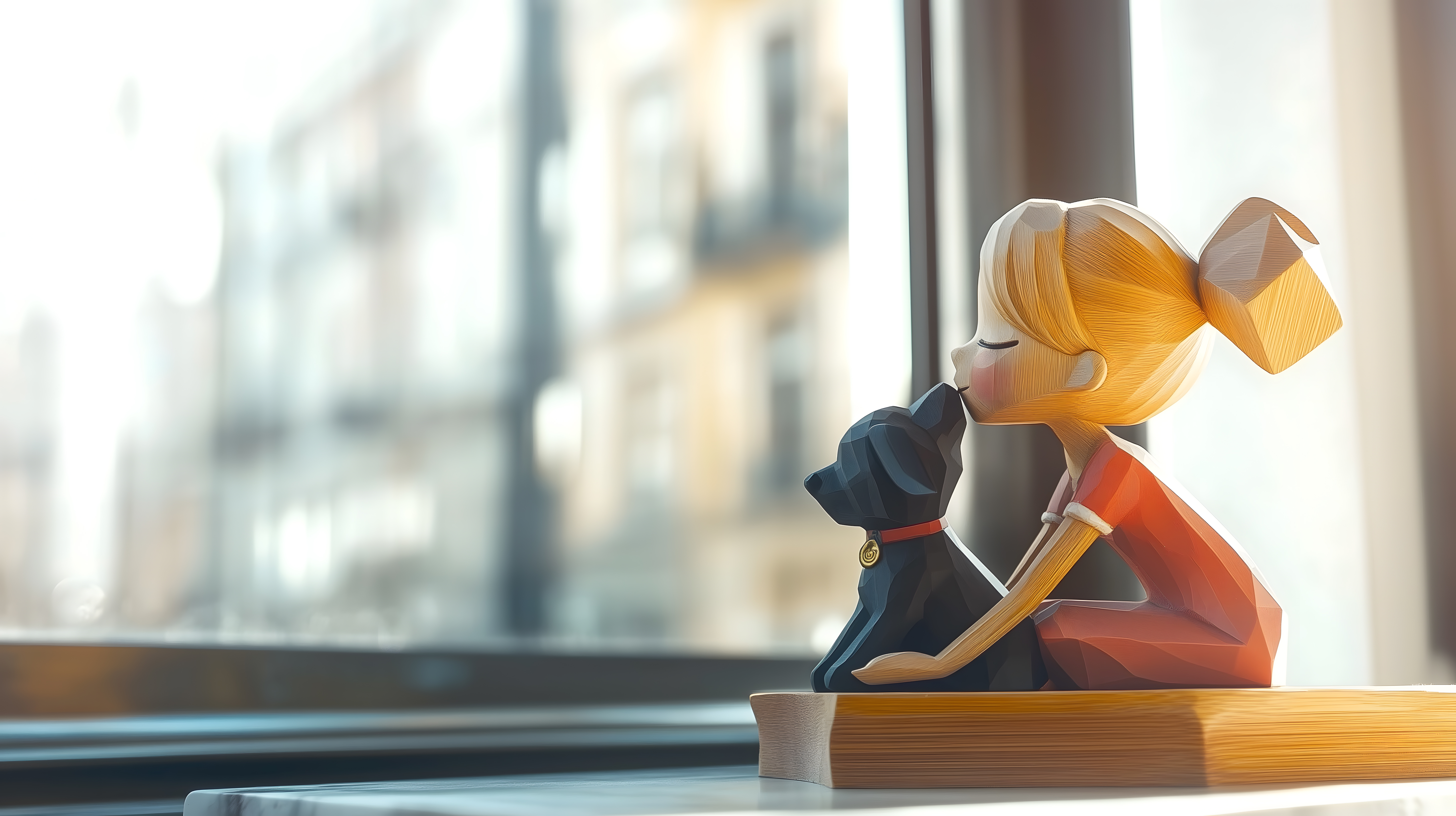 Das Foto zeigt eine moderne Holzfigur, die ein Mädchen mit einem Hund darstellt. Das Objekt ist in einem geometrischen, minimalistischen Design gehalten und steht vor einem hellen Fenster, durch das natürliches Tageslicht einfällt. Die Farbtöne sind warm und harmonisch, mit Akzenten in Orange und Schwarz. Das Bild vermittelt eine ruhige, ästhetische Atmosphäre und eignet sich hervorragend als Hintergrund oder Gestaltungselement für Blogs, Social-Media-Beiträge, Werbematerialien und Büroeinrichtung. Das hochauflösende Foto ist als kostenloses Stockfoto unter der Creative-Commons-Lizenz verfügbar.