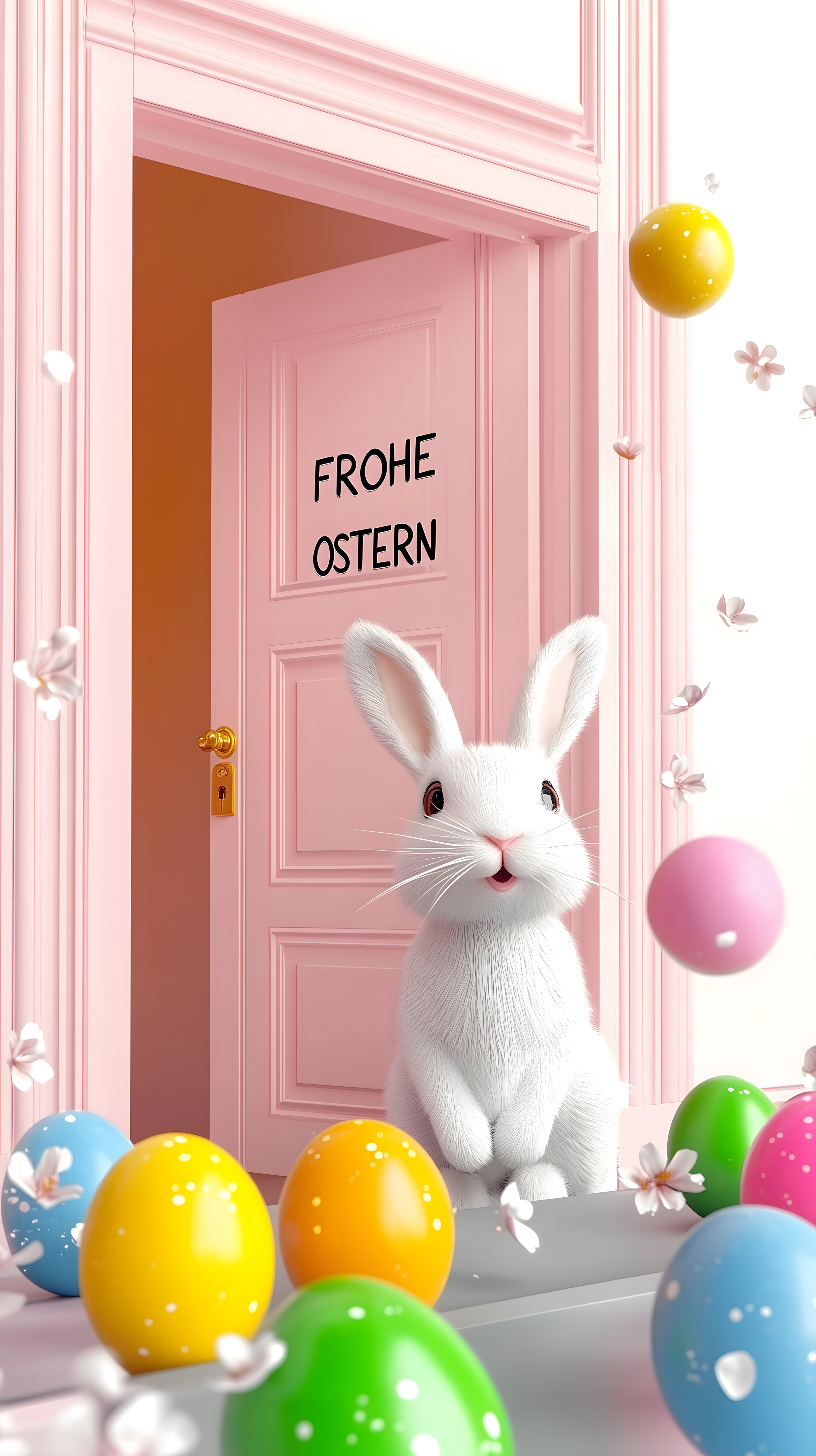 Dieses fröhliche Osterfoto zeigt einen weißen Osterhasen, der vor einer rosa bemalten Tür sitzt. Auf der Tür ist der Schriftzug 'Frohe Ostern' zu lesen. Um den Hasen herum sind bunte Ostereier in verschiedenen Farben verstreut. Die Szene wird durch zarte Blüten ergänzt, die den Raum zusätzlich verschönern. Dieses hochauflösende Stockfoto ist unter der Creative Commons-Lizenz kostenlos nutzbar und eignet sich perfekt für die Gestaltung von Oster-Themen in Blogs, Newslettern, Social Media-Kanälen oder Werbematerialien.
