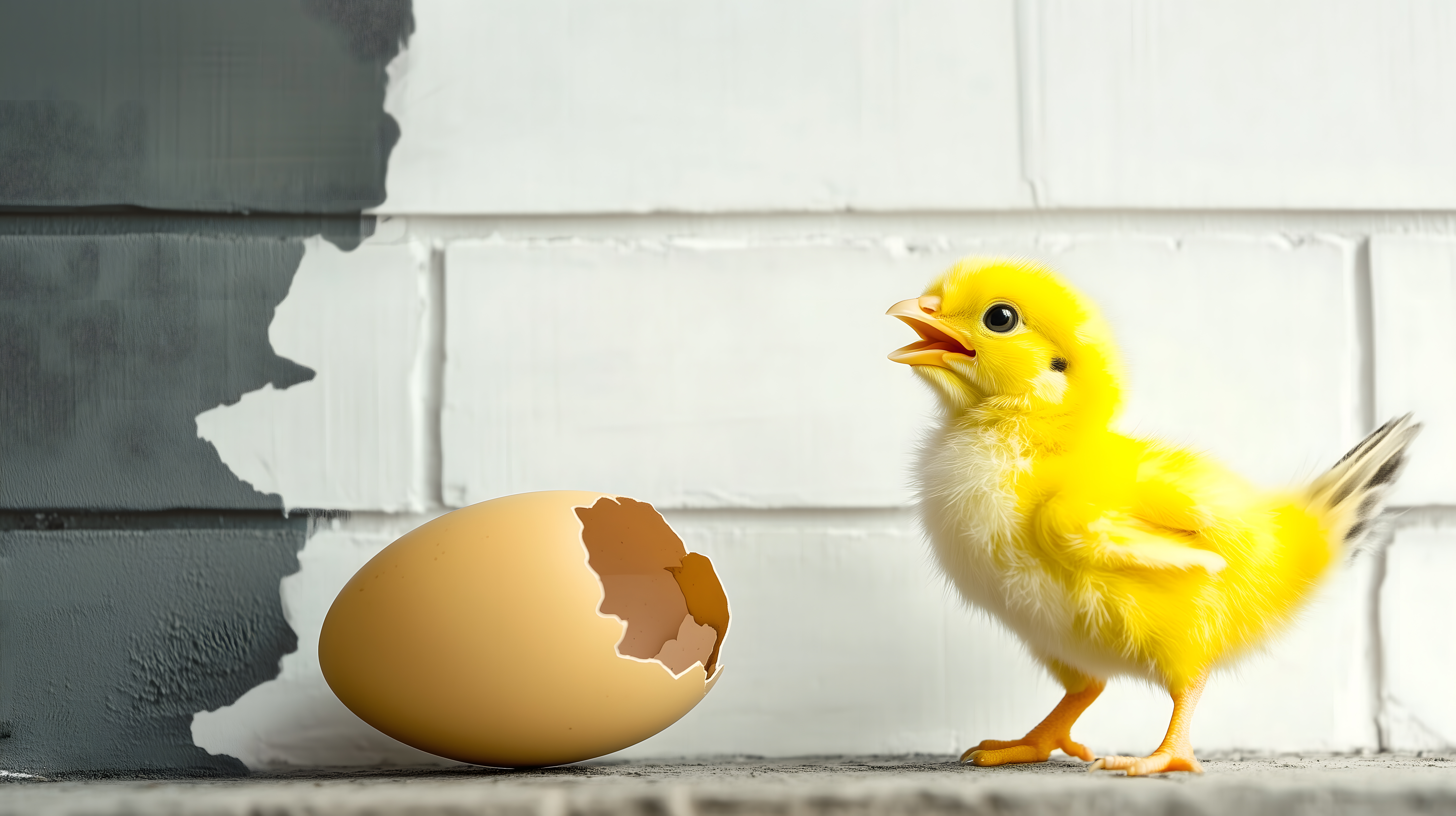 Das Bild zeigt ein frisch geschlüpftes, zitronengelbes Küken, das neben einer zerbrochenen Eierschale steht. Die Komposition ist minimalistisch und fokussiert, mit dem Küken als klarem Blickfang vor einer neutralen, grauen Hintergrundwand. Das Bild vermittelt ein Gefühl von Neuanfang, Wachstum und Entwicklung, passend zu Themen wie Ostern oder Frühling. Es eignet sich hervorragend als kostenloses Stockfoto für Blogs, Websites, Newsletter oder Werbematerialien in hoher Auflösung und unter der Creative-Commons-Lizenz.