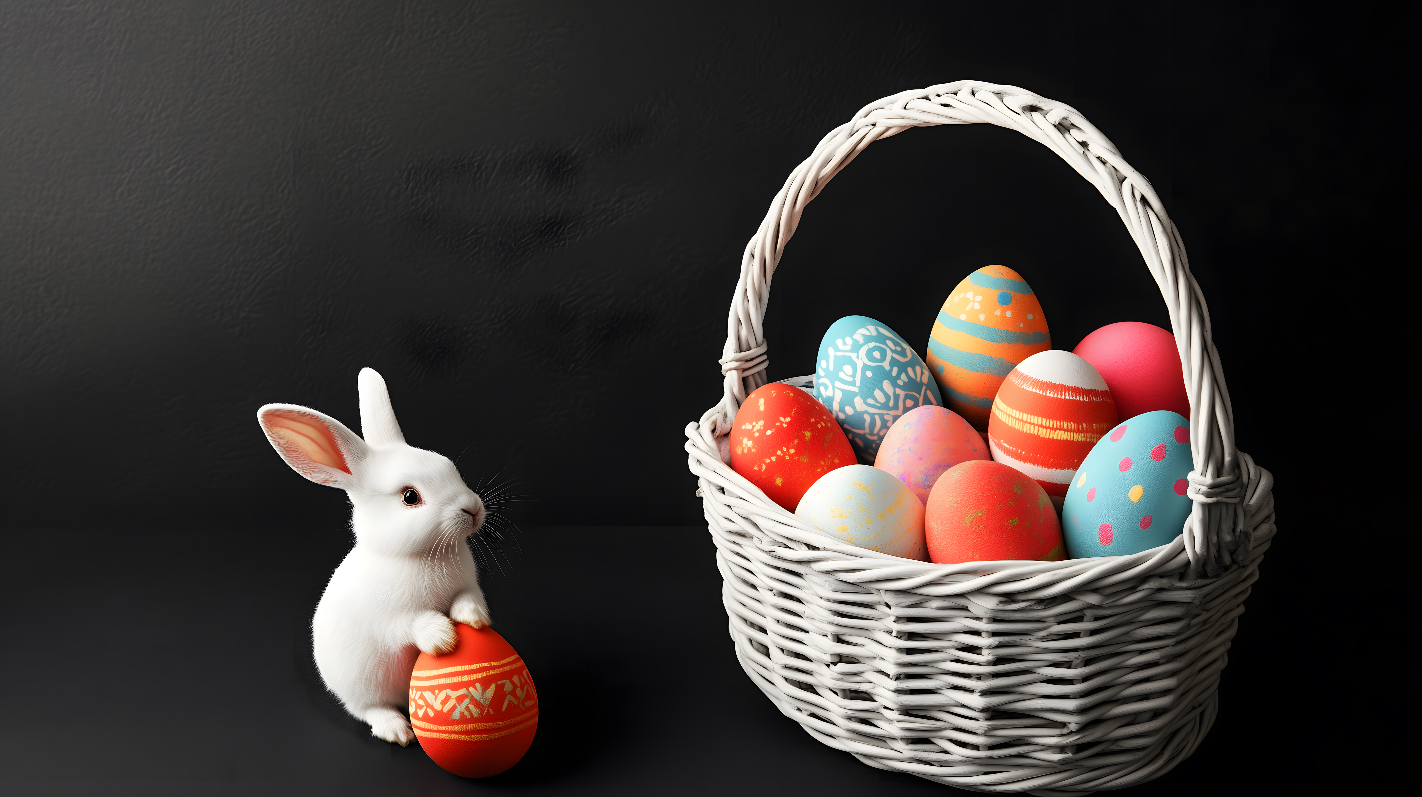 Das Bild zeigt eine festliche Osterszene mit einem weißen Hasen und einem Korb voller bunt bemalter Ostereier. Die Eier sind in verschiedenen Pastellfarben und Mustern gestaltet, was eine lebendige und fröhliche Stimmung vermittelt. Der Hase sitzt auf schwarzem Hintergrund neben dem Weidenkorb, der die Ostereier in der Mitte des Bildes hervorhebt. Dieses Foto eignet sich hervorragend als Motiv für Osterdekorationen, Werbematerialien oder Social-Media-Posts rund um das Osterfest. Als kostenloses Stockfoto in hoher Auflösung und unter einer Creative-Commons-Lizenz kann es vielfältig in Print- und Onlinemedien eingesetzt werden.