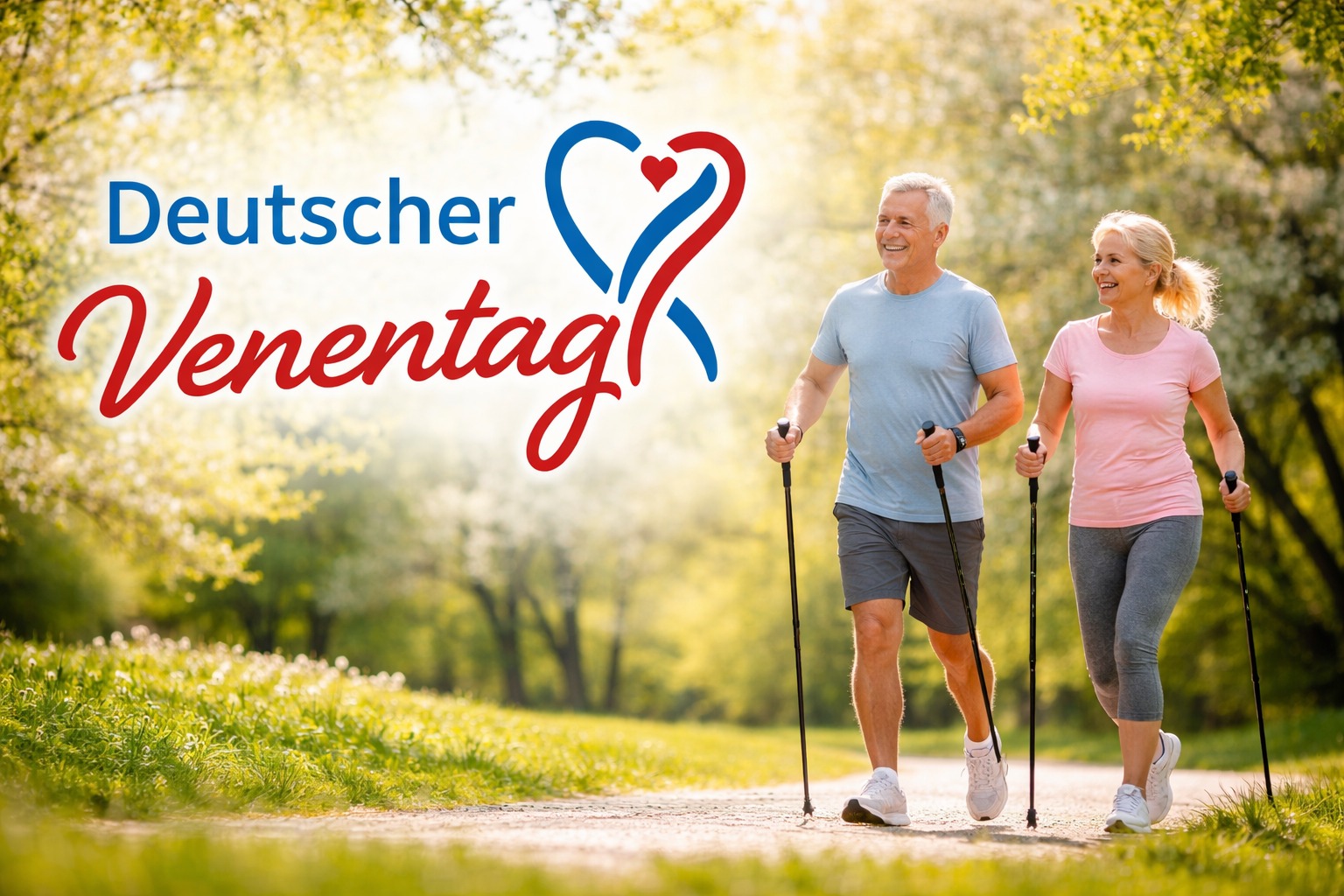 Dieses Foto zeigt zwei ältere Menschen, die gemeinsam einen Spaziergang in der Natur unternehmen. Sie tragen sportliche Kleidung und Nordic-Walking-Stöcke, was auf eine aktive Freizeitgestaltung hindeutet. Der Hintergrund ist von bunten Bäumen und einem sonnendurchfluteten Waldweg geprägt, was eine idyllische, erholsame Atmosphäre schafft.