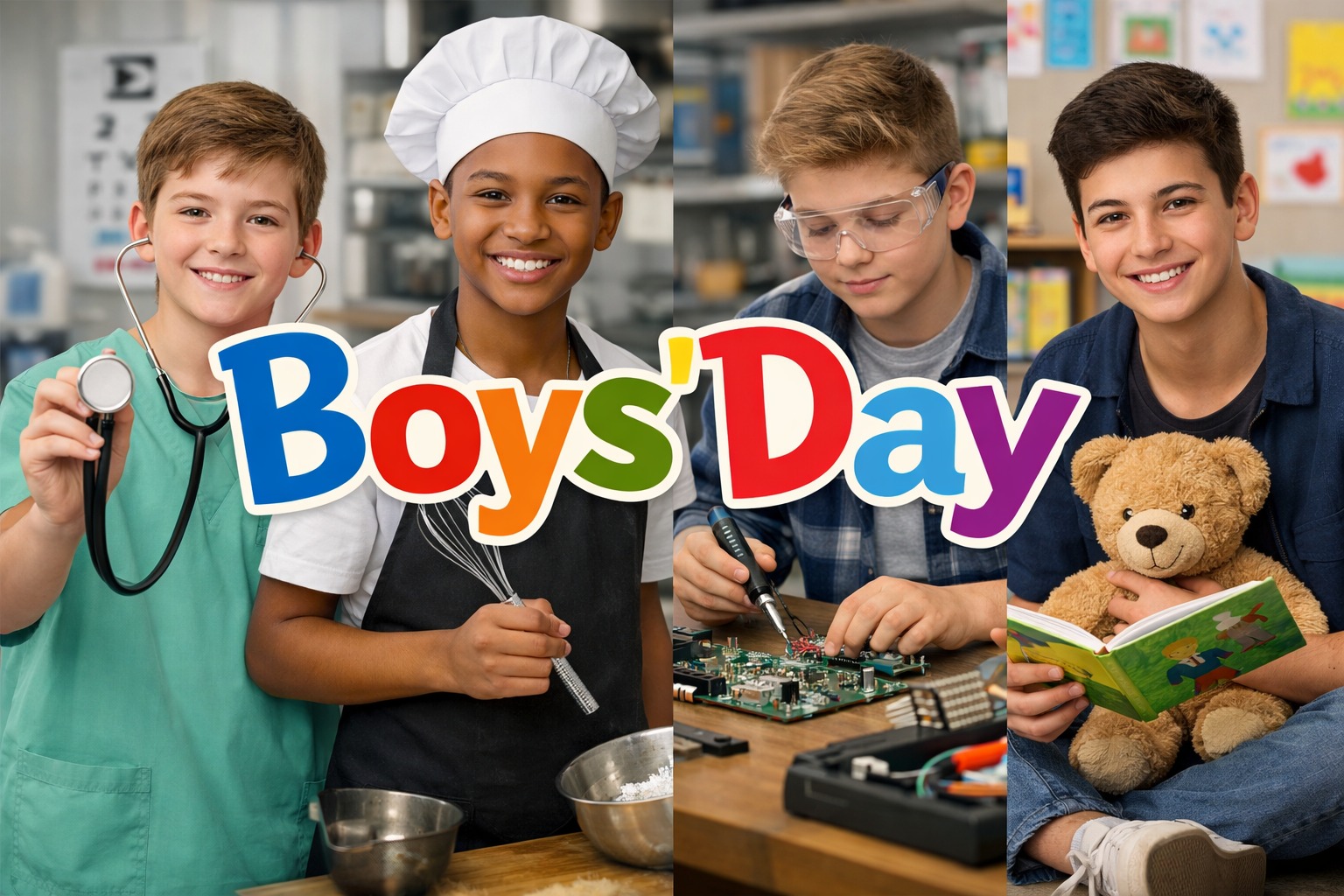 Dieses lebendige Foto zeigt eine Gruppe von vier Jungen, die in einer Schul-Umgebung verschiedene Aktivitäten ausüben. Der Fokus liegt auf Vielfalt und Teamarbeit - von einem Jungen im Arztkittel über einen in der Computerelektronik bis hin zu einem, der mit einem Teddybären liest. Die bunte Szene vermittelt den Eindruck einer aktiven, kreativen und zukunftsorientierten Lernumgebung, in der die Schüler ihre Talente und Interessen entfalten können. Solche Bilder können in Bildungsberichten, Schul-Websites oder Werbematerialien für MINT-Fächer eingesetzt werden, um die Bedeutung ganzheitlicher Förderung und interdisziplinärer Herangehensweisen zu unterstreichen.