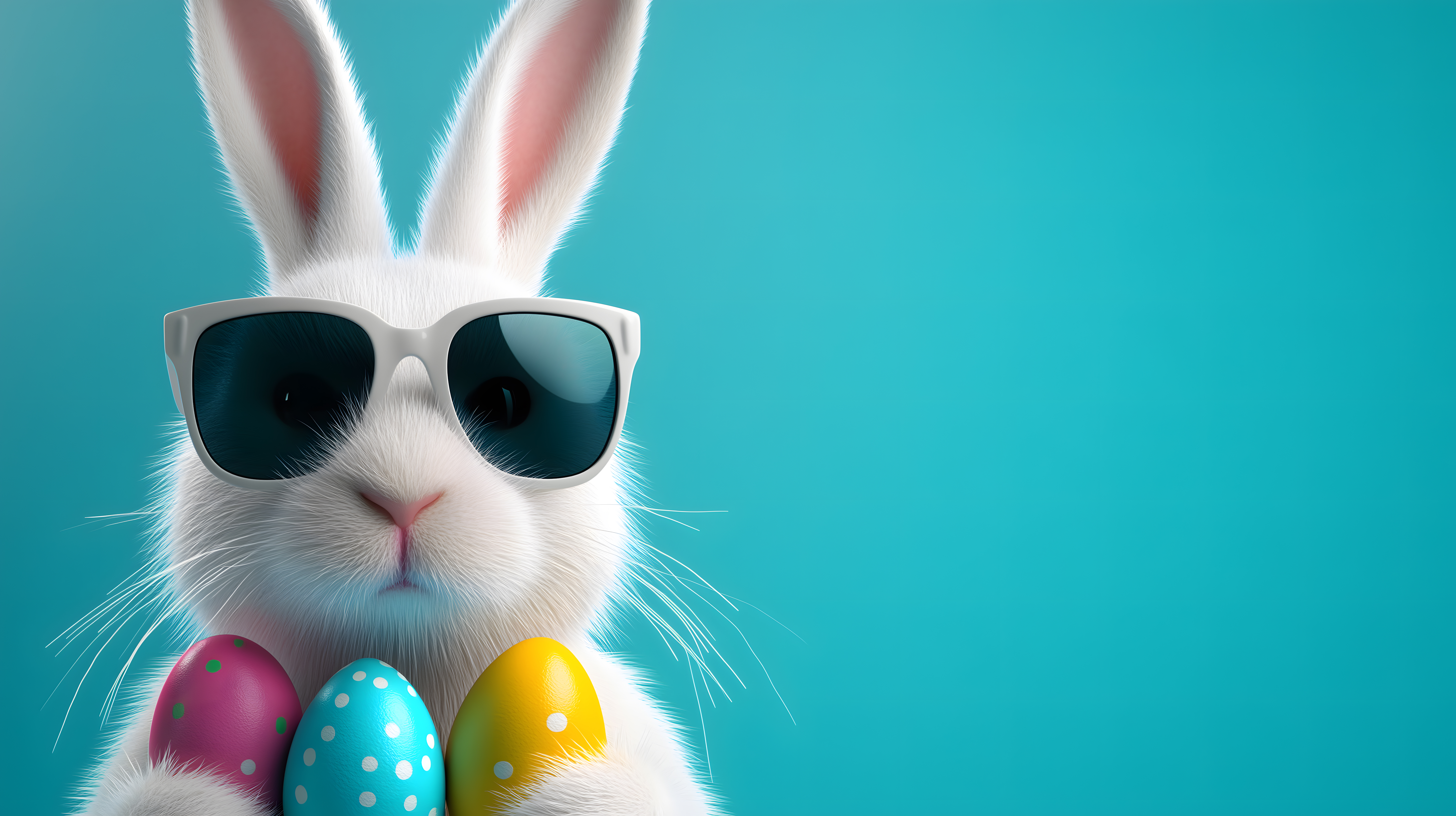 Dieses charmante Bild zeigt einen weißen Osterhasen mit flauschigem Fell, der eine moderne, weiße Sonnenbrille trägt und bunte, gepunktete Ostereier umringt. Der Hase ist vor einem einfarbigen, türkisfarbenen Hintergrund platziert, der den Fokus ganz auf das Hauptmotiv lenkt. Die Farbpalette aus Weiß, Pink, Gelb und Türkis wirkt frisch und frühlingshaft. Dieses Foto ist als kostenloses Stockfoto in hoher Auflösung und unter Creative-Commons-Lizenz erhältlich. Es eignet sich bestens für den Einsatz in Newslettern, Blogbeiträgen, Social-Media-Posts oder anderen Werbematerialien rund um Ostern und den Frühling.