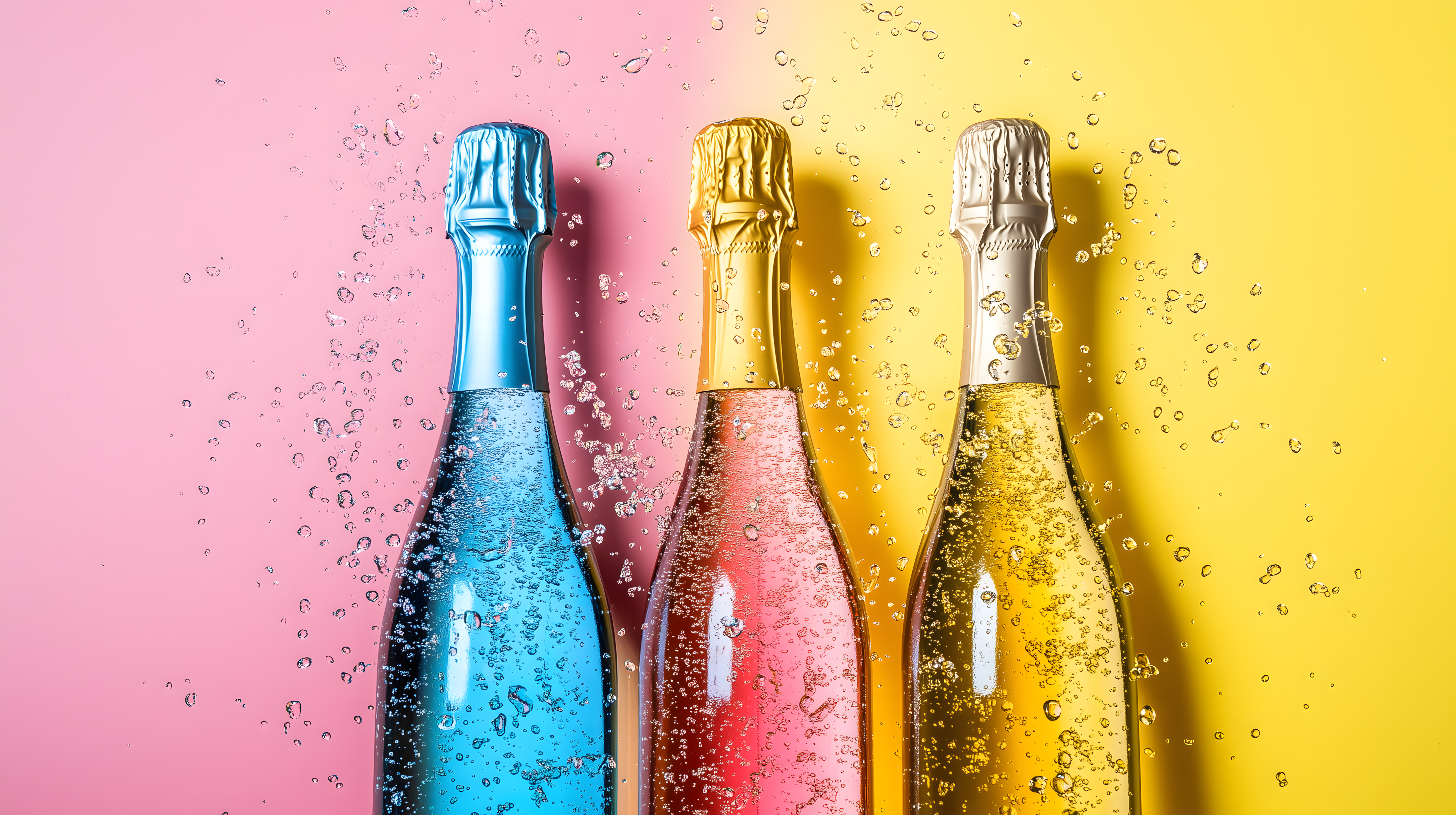 Dieses farbenfrohe Bild zeigt drei Sektflaschen in knalligen Regenbogenfarben vor einem rosa und gelben Hintergrund. Die Flaschen spritzen Blasen und Schaum, was eine festliche und feierliche Stimmung erzeugt. Das Foto ist perfekt für den Einsatz in Blogs, Newslettern, Social-Media-Beiträgen oder Werbekampagnen rund um Feiern, Partys und Feste. Das hochauflösende Stockfoto ist unter einer Creative-Commons-Lizenz frei verfügbar.
