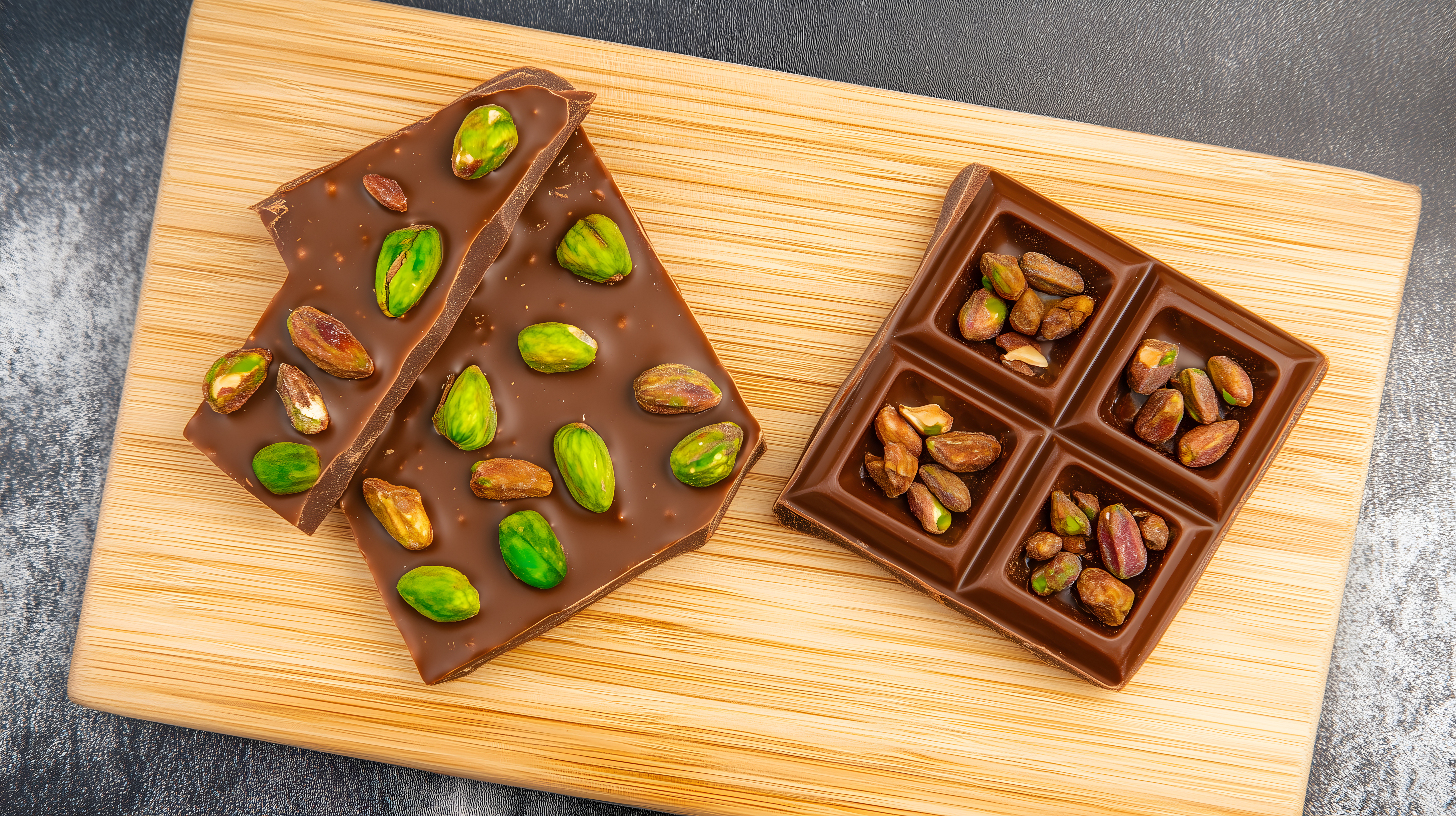 Dieses appetitliche Foto zeigt ein köstliches Arrangement aus dunkler Schokolade mit eingebetteten Pistazienkernen. Die Schokoladentafeln sind auf einem rustikalen Holzbrett angerichtet, das eine natürliche und elegante Optik verleiht. Die grünen Pistazien kontrastieren wunderbar mit dem dunklen Kakaoton und verleihen dem Bild einen edlen Farbakzent. Diese Aufnahme eignet sich perfekt für Blogs, Social-Media-Beiträge, Newsletter-Designs oder auch für Werbekampagnen rund um Schokolade, Nüsse und feine Leckereien. Als hochwertiges, kostenloses Stockfoto unter Creative-Commons-Lizenz kann es vielfältig eingesetzt werden.