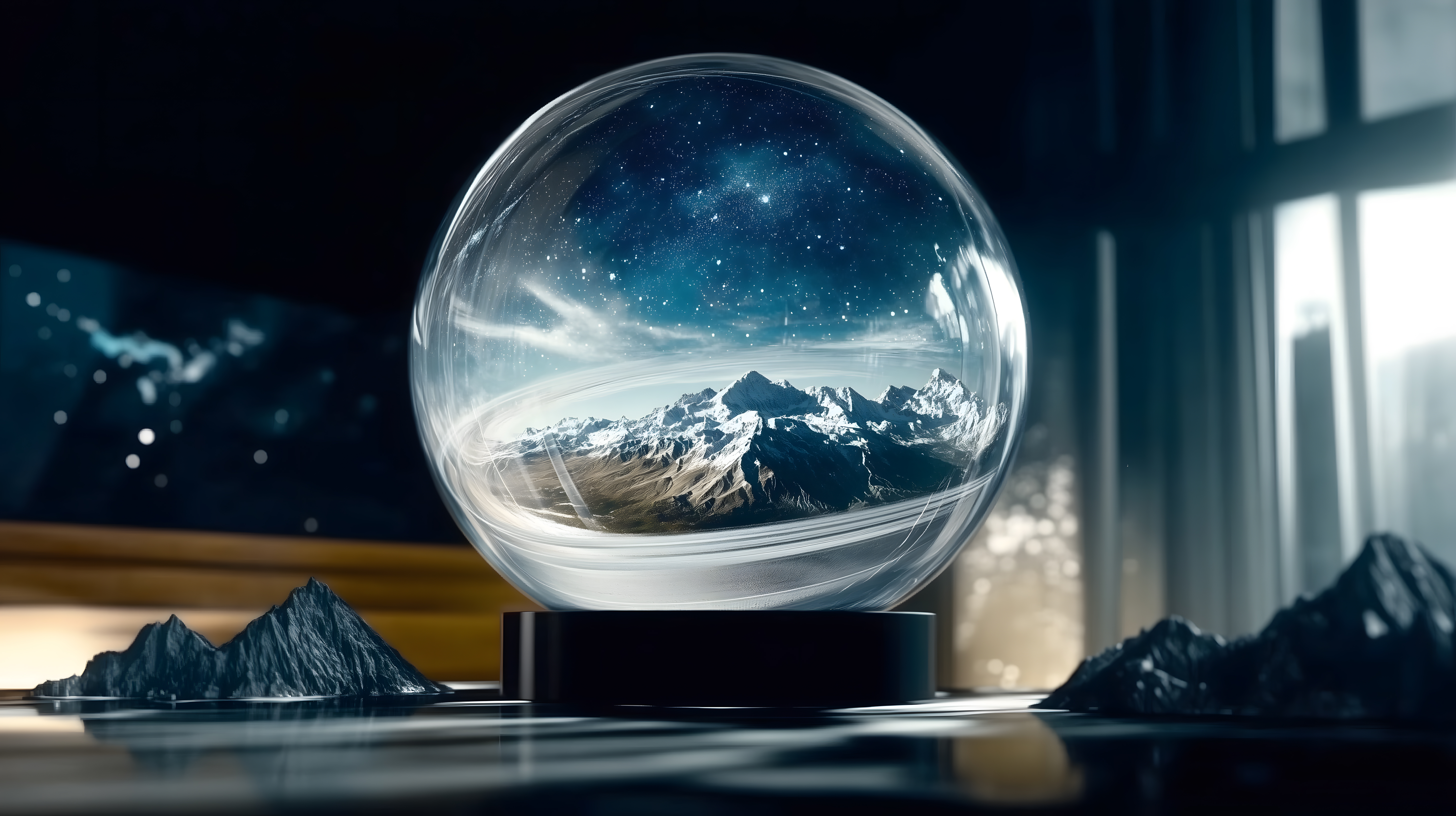 Dieses faszinierende Bild zeigt eine Kristallkugel, die eine eindrucksvolle Berglandschaft mit einem sternenbesäten Nachthimmel umgibt. Die Kugel steht auf einem Holzsockel vor einem hellen Fenster, wodurch eine surrealistische, fast magische Atmosphäre entsteht. Die Perspektive lässt den Betrachter tief in die Weiten des Universums eintauchen und lädt zur Meditation und Fantasie ein.