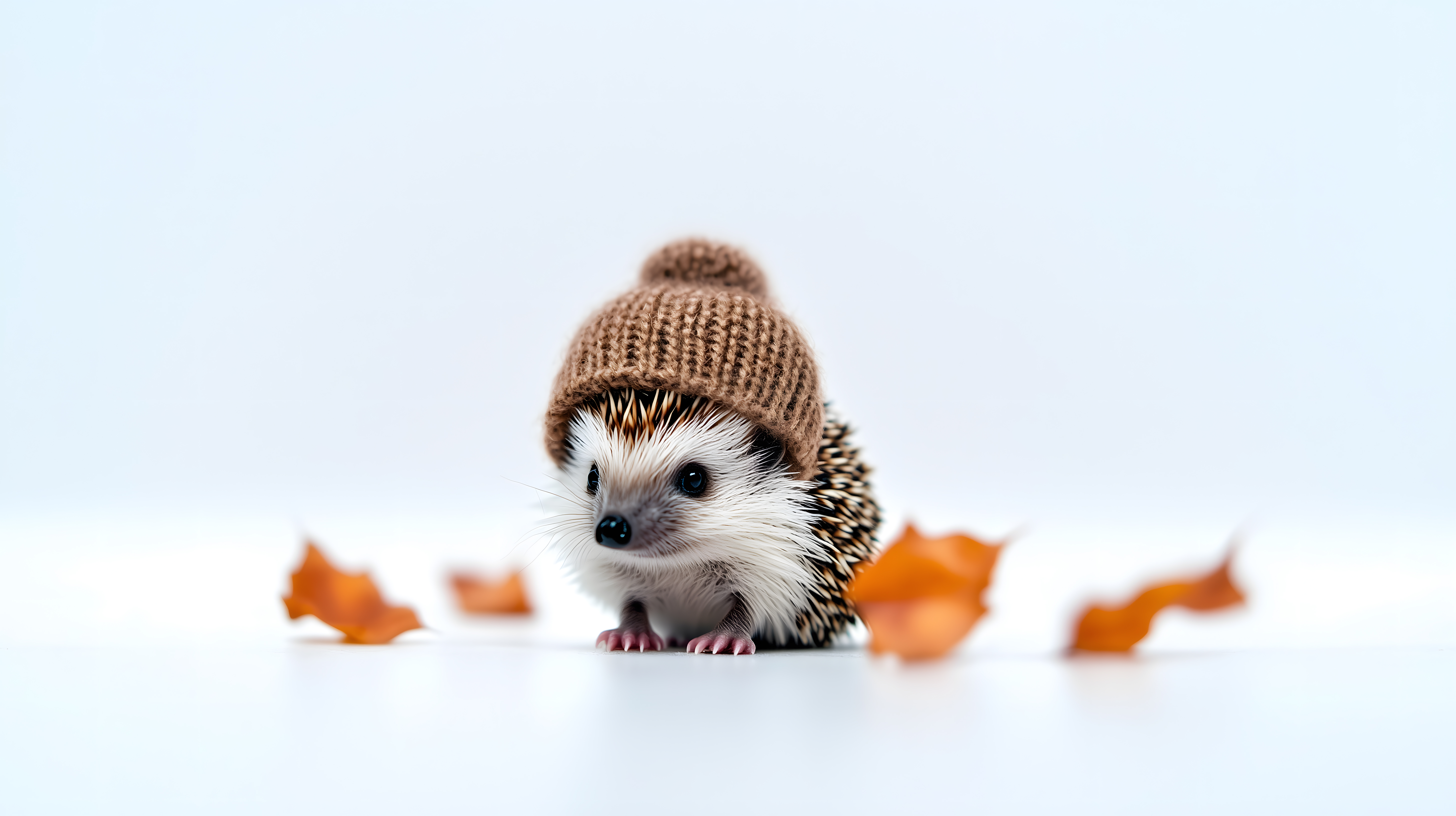 Das Bild zeigt einen niedlichen kleinen Igel, der eine braune Wintermütze trägt und inmitten einiger herbstlicher orangefarbener Blätter auf einem weißen Hintergrund sitzt. Der Fokus liegt auf dem Igel, der mit seinen großen dunklen Augen den Betrachter direkt anzuschauen scheint. Das Bild bietet einen schönen Kontrast zwischen den warmen Herbstfarben und dem kühlen weißen Hintergrund. Es eignet sich hervorragend als Motiv für Blogbeiträge, Werbekampagnen oder Posts in sozialen Medien rund um die Themen Herbst, Weihnachten oder Haustiere. Dieses hochauflösende und kostenlose Stockfoto steht unter der Creative-Commons-Lizenz zur Verfügung.