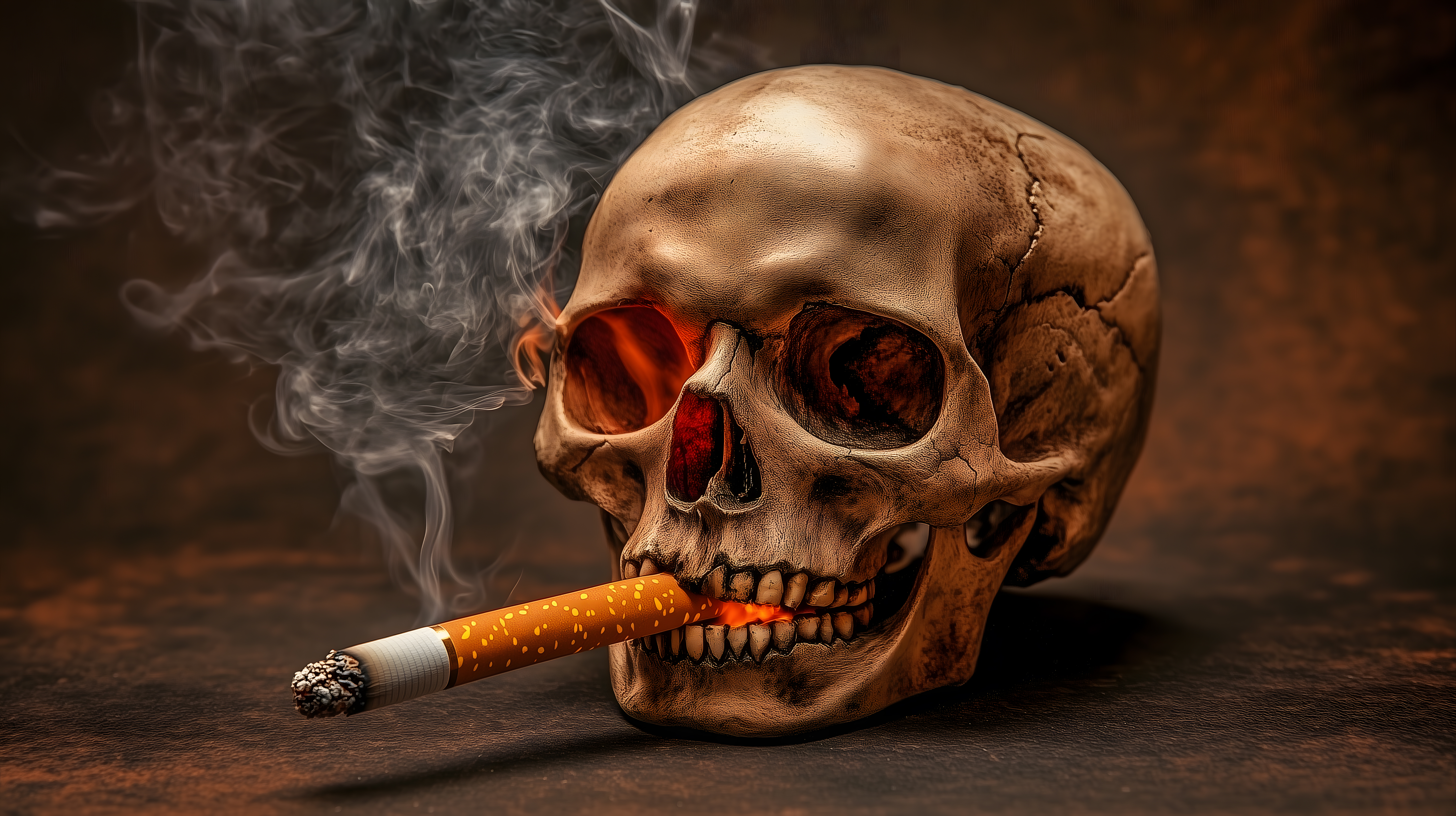 Das Bild zeigt einen menschlichen Totenkopf, der eine brennende Zigarette zwischen den Zähnen hält. Der Schädel ist rau und beschädigt, umgeben von Rauchschwaden, was eine starke Metapher für die schädlichen Folgen des Rauchens darstellt. Diese düstere und symbolträchtige Darstellung kann als Warnung vor den Gefahren des Tabakkonsums und der Tabaksucht eingesetzt werden, beispielsweise in Anti-Rauchen-Kampagnen, Gesundheitsvorsorge-Materialien oder Präventionsangeboten. Das Foto ist in hoher Auflösung und unter einer Creative-Commons-Lizenz verfügbar, sodass es kostenfrei für verschiedene Zwecke genutzt werden kann.