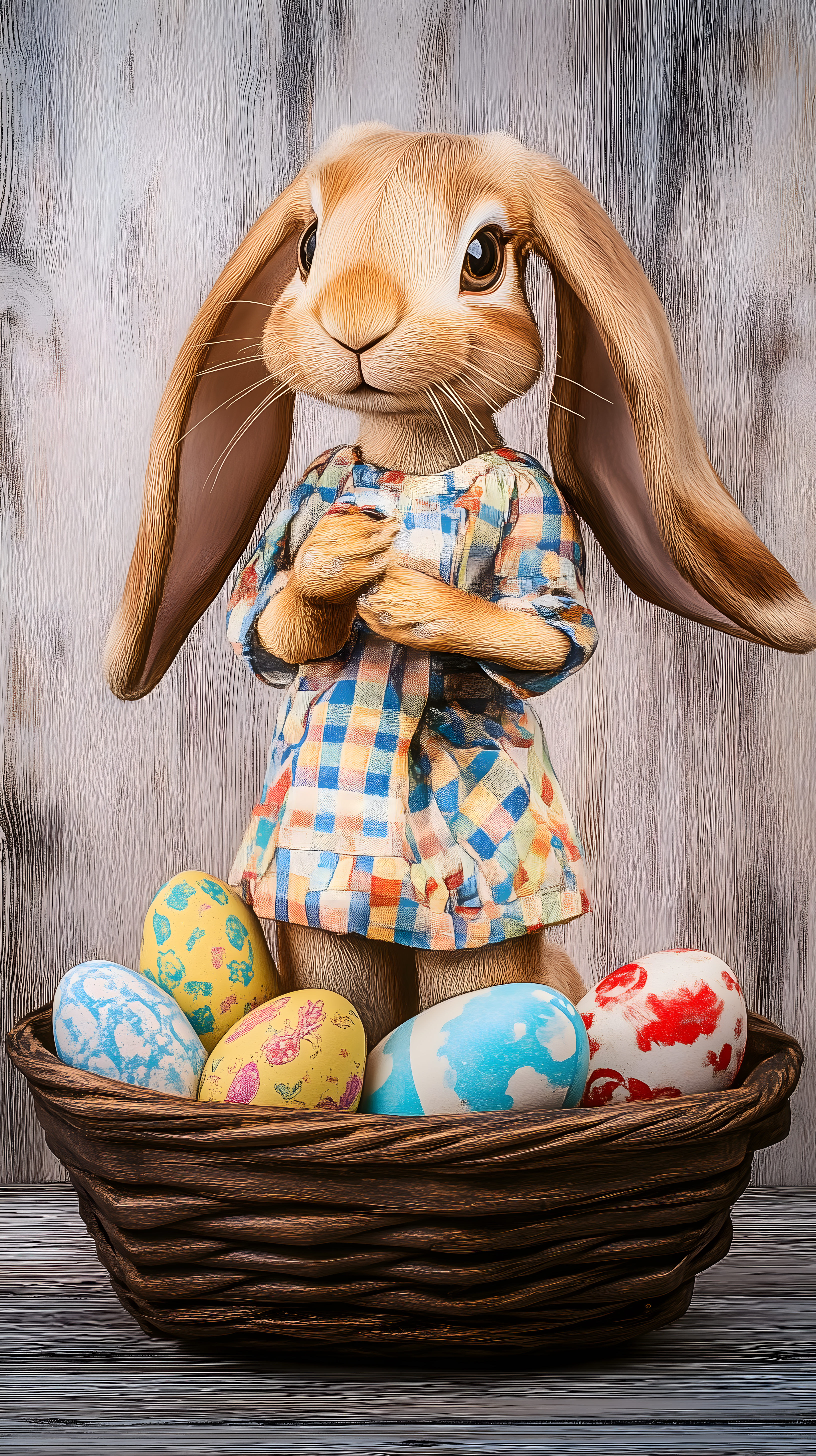 Dieses fantasievoll gestaltete Foto zeigt eine süße Osterhasen-Figur, die in einem Korb voller bunter, bemalter Ostereier steht. Der Hase trägt ein farbenfrohes, kariertes Kostüm und schaut mit großen, glänzenden Augen direkt in die Kamera. Die Eier im Korb sind in verschiedenen Pastellfarben und Mustern bemalt, was dem Bild eine festliche, frühlinghafte Atmosphäre verleiht. Dieses hochwertige Stockfoto eignet sich perfekt als Hintergrund oder Dekoration für Ostergrußkarten, Einladungen, Social-Media-Posts oder Werbebroschüren rund um das Osterfest. Es ist in hoher Auflösung verfügbar und steht unter einer Creative-Commons-Lizenz zur Verwendung frei.