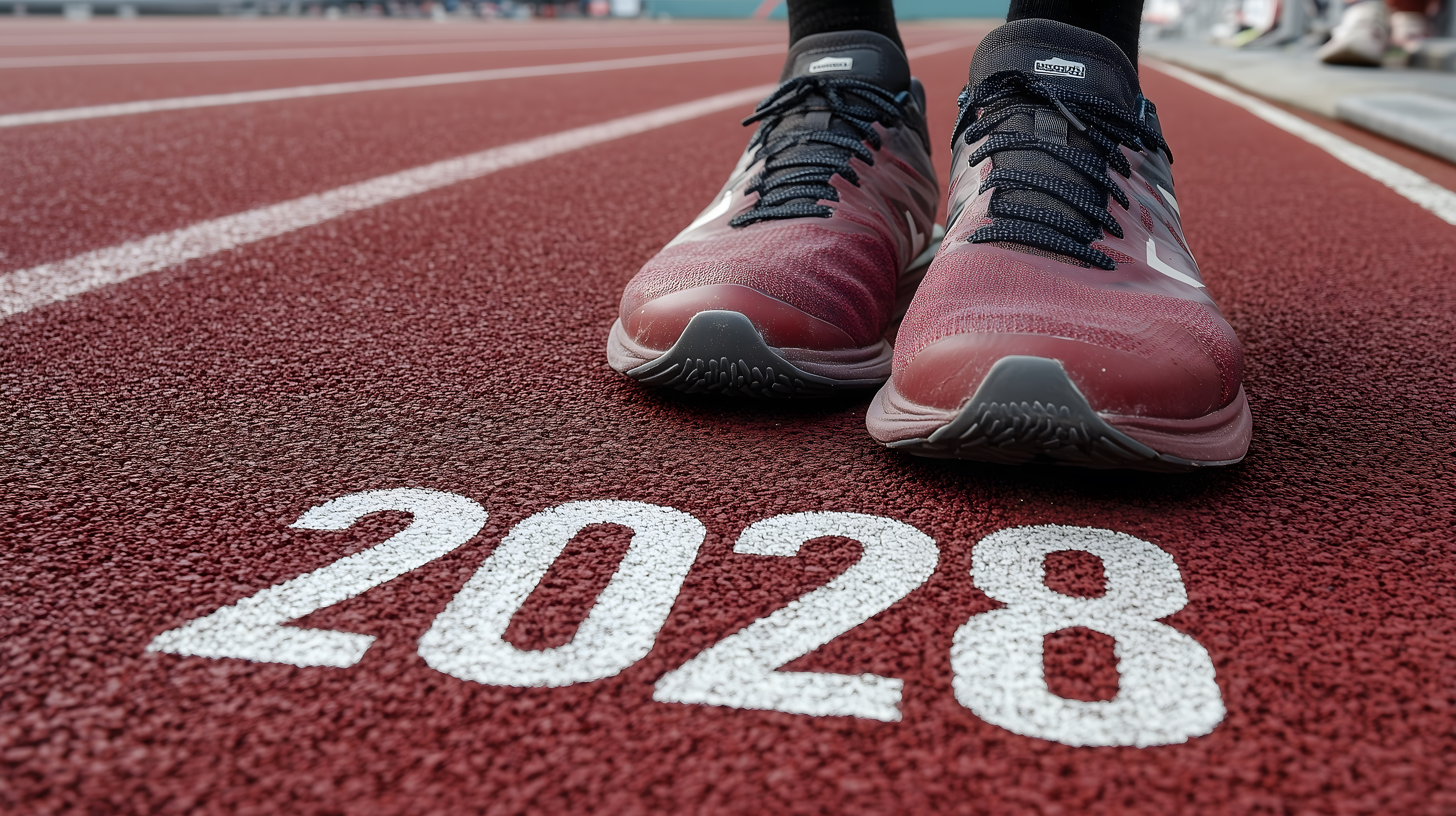 Das Bild zeigt ein Paar hochwertige Laufschuhe auf einer roten Leichtathletikbahn. Die Schuhe haben ein modernes, sportliches Design in den Farben Rot und Schwarz. Sie stehen vor der Jahreszahl 2028, die auf den Boden gemalt ist. Das Foto vermittelt einen dynamischen, motivierenden Eindruck und könnte gut als Titelbild für einen Blog-Beitrag zu Laufsport, Training oder Fitnesstrends verwendet werden. Es eignet sich auch hervorragend für Werbematerialien von Sportartikelherstellern oder Sportevents. Als hochwertiges Stockfoto in hoher Auflösung unter einer Creative-Commons-Lizenz ist es für vielfältige Einsatzzwecke geeignet.
