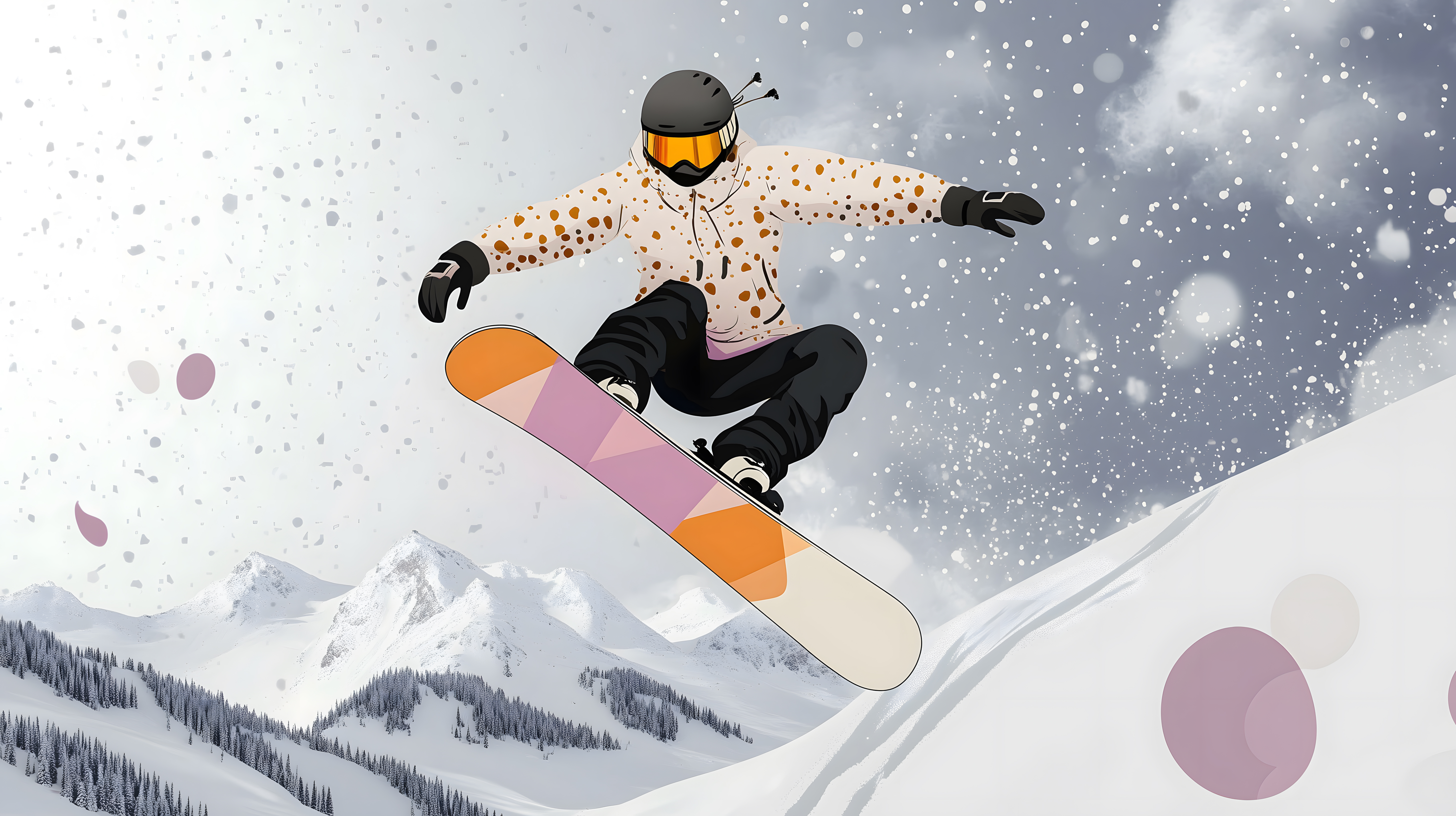 Das Bild zeigt einen dynamischen Snowboard-Sprung in einer verschneiten Berglandschaft der Alpen. Der Snowboarder ist in einer ausgeprägten, athletischen Pose dargestellt, mit gespreizten Beinen und ausgestreckten Armen, als würde er durch die Luft fliegen. Die Umgebung ist von dichtem Schneefall geprägt, der eine stimmungsvolle, winterliche Atmosphäre schafft. Die Illustration weist einen grafischen, stilisierten Charakter auf, mit einer auffälligen Farbpalette in Orange, Rosa und Grautönen. Dieses Stockfoto eignet sich hervorragend für den Einsatz in Blogs, Newslettern, Social-Media-Beiträgen oder Werbematerialien rund um Winter- und Extremsportthemen. Es ist in hoher Auflösung und unter einer Creative-Commons-Lizenz frei verfügbar.