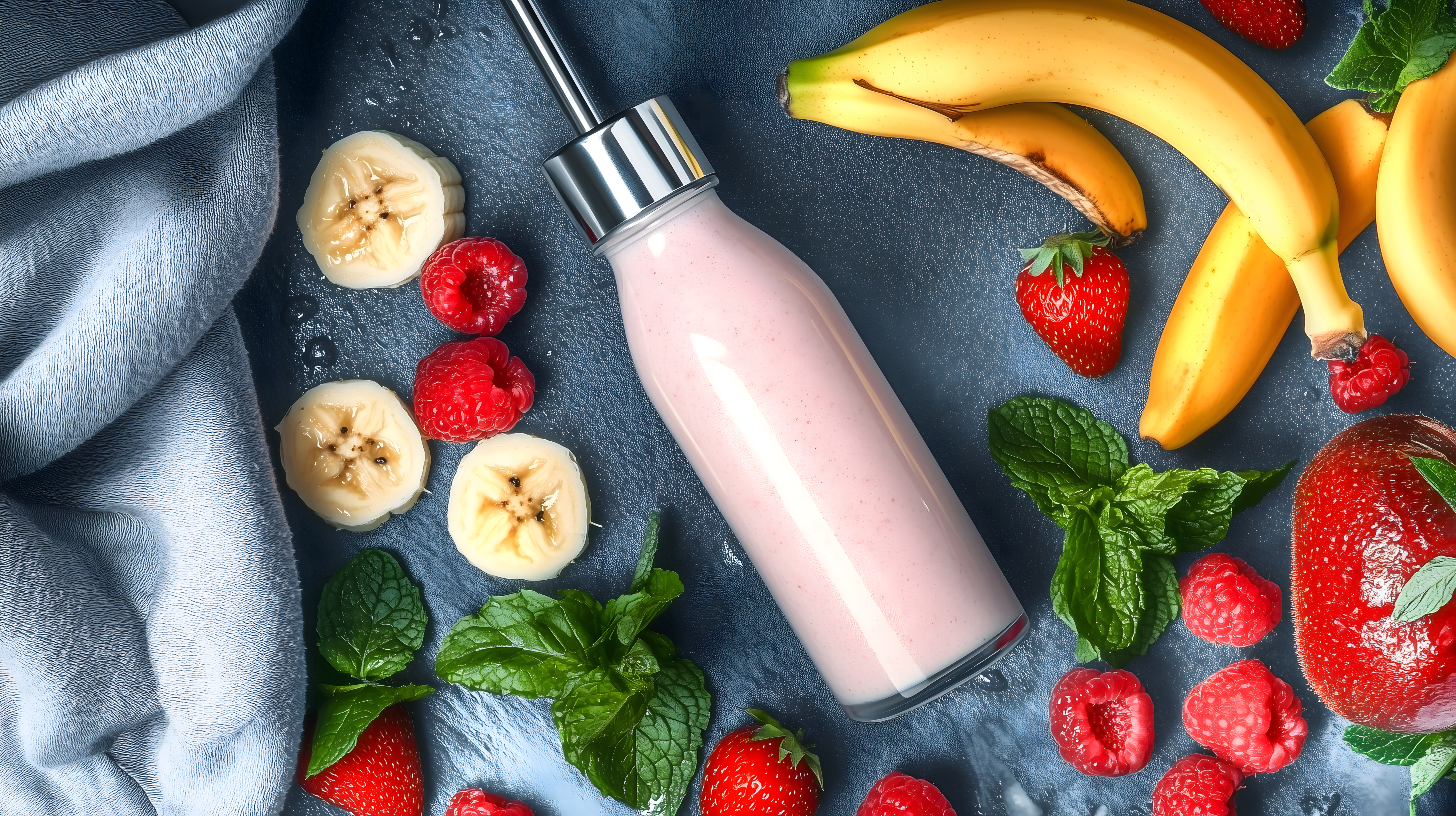 Dieses Stockfoto zeigt die Zubereitung eines leckeren Smoothies mit frischen Zutaten wie Bananen, Erdbeeren, Himbeeren und Minze auf einem dunklen, strukturierten Hintergrund. Die Perspektive ist von oben, wodurch das Arrangement der Zutaten sowie das transparente Glasgefäß mit dem fertigen Getränk im Zentrum des Bildes stehen. Die Farbpalette aus kräftigen Rot-, Gelb- und Grüntönen sowie die klare, aufgeräumte Komposition erzeugen einen appetitlichen und gesunden Gesamteindruck. Dieses hochauflösende Foto eignet sich hervorragend für Verwendungen in Blogs, Newslettern, Social-Media-Beiträgen oder Werbematerialien rund um das Thema gesunde Ernährung und Smoothie-Zubereitung. Es steht unter einer kostenlosen Creative-Commons-Lizenz zur Verfügung.