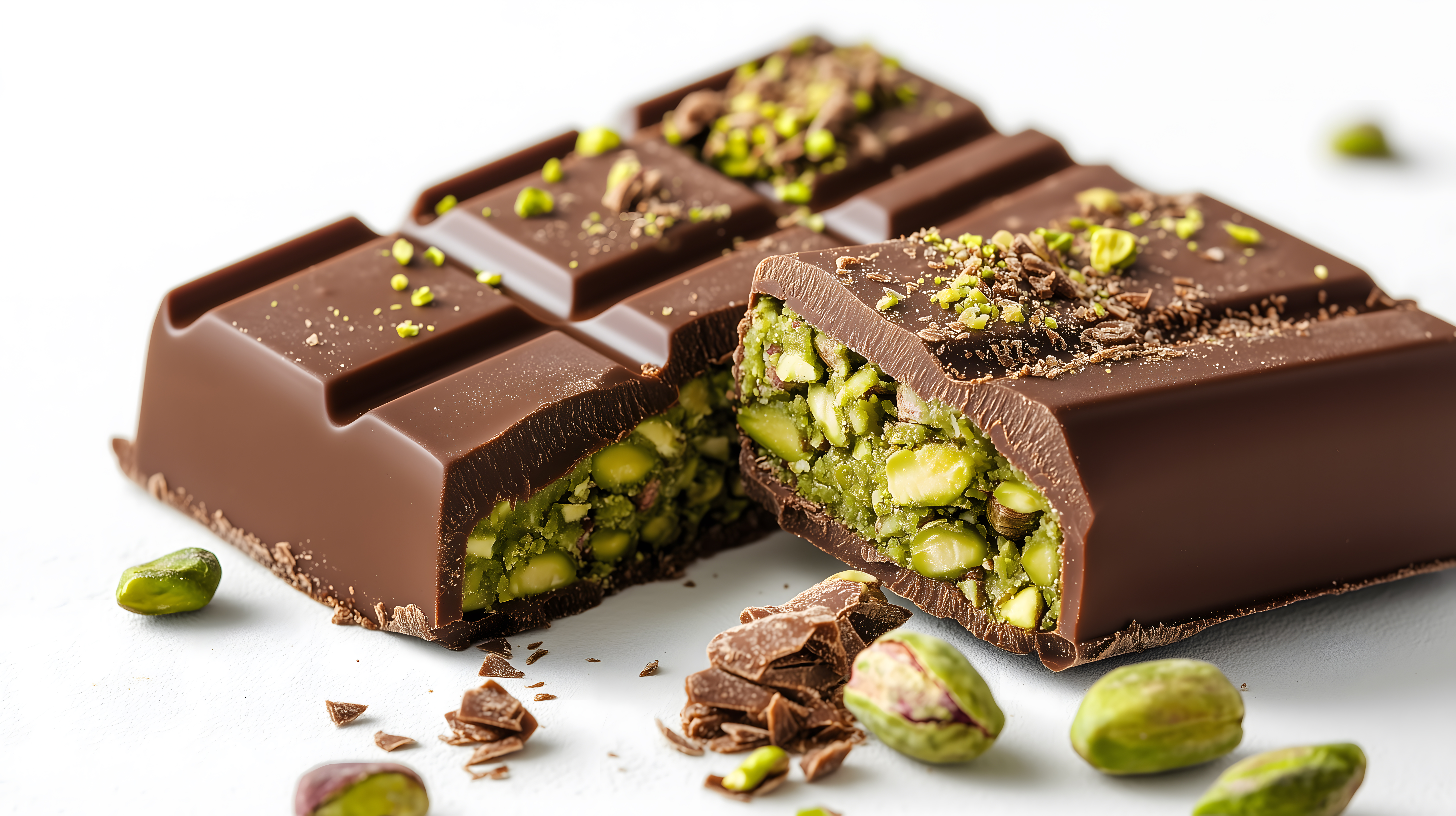Dieses Foto zeigt eine Nahaufnahme von dunkler Schokolade mit einer köstlichen Pistazien-Füllung. Die Schokolade ist in Stücke gebrochen, wodurch die grünen Pistazien-Stückchen gut sichtbar werden. Der Hintergrund ist einfach und weiß gehalten, um den Fokus ganz auf die Schokolade zu richten. Dieses Bild eignet sich hervorragend für den Einsatz in Blogs, Newslettern, Social-Media-Beiträgen oder Werbematerialien, bei denen es um Süßwaren, Genuss oder Lebensmittel geht. Als kostenloses Stockfoto in hoher Auflösung und unter Creative-Commons-Lizenz kann es frei genutzt werden.