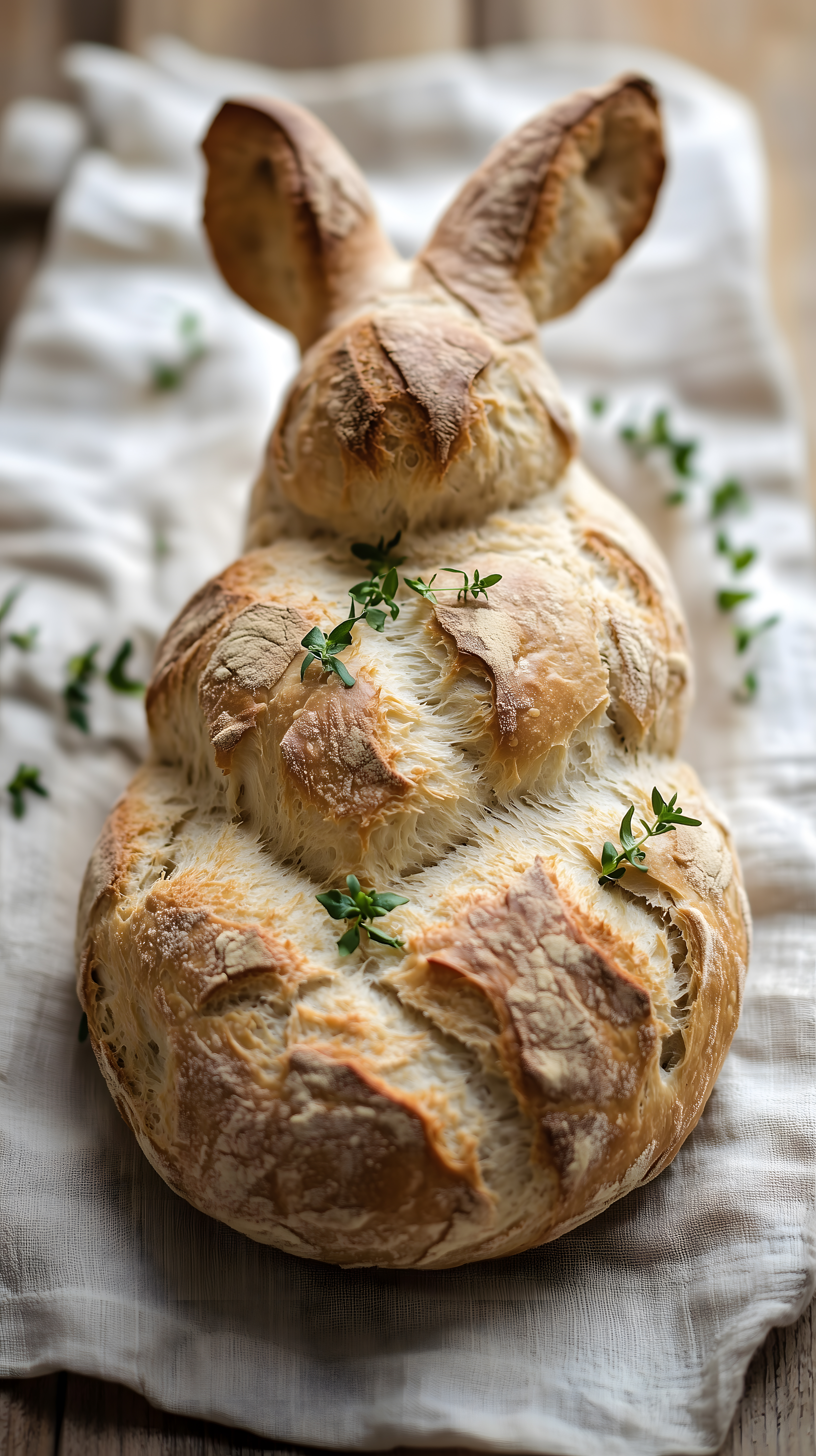 Das Bild zeigt ein kreativ geformtes Brot in Form eines Osterhasen, dekoriert mit frischen Kräutern. Die Nahaufnahme unterstreicht die detailreiche Oberfläche des Brots und die natürliche, rustikale Optik. Dieses Foto eignet sich hervorragend als Osterdekoration oder als Hintergrundbild für Frühlings- und Osterpost in Blogs, Newslettern oder auf Social-Media-Kanälen. Als kostenloses, hochauflösendes Stockfoto unter der Creative-Commons-Lizenz kann es vielseitig in Projekten eingesetzt werden.