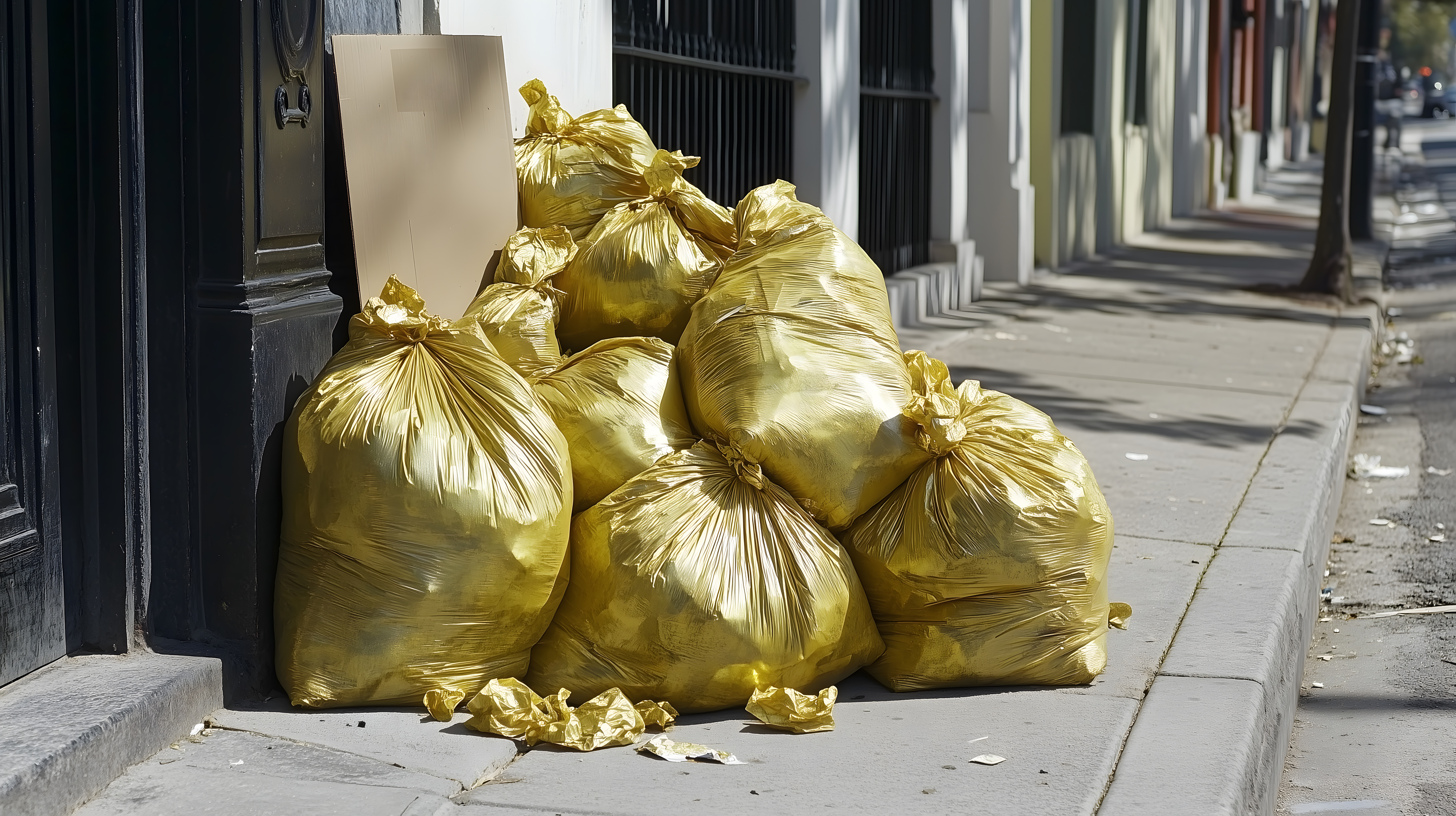 Das Bild zeigt eine Reihe von goldenen Müllsäcken, die auf einem städtischen Gehweg abgestellt sind. Der auffallende Kontrast zwischen den glänzenden, luxuriös wirkenden Säcken und der grauen, urbanen Umgebung erzeugt einen überraschenden und surrealen Eindruck. Die Komposition betont die Anordnung und Textur der Säcke, die wie kunstvolle Objekte in Szene gesetzt sind. Dieses ungewöhnliche Fotomotiv eignet sich hervorragend für kreative Konzeptfotografie, Blogbeiträge, Werbung oder Social-Media-Postings, bei denen ein Akzent auf Unkonventionalität, Ästhetik und Perspektive gelegt werden soll. Als kostenloses Stockfoto in hoher Auflösung und unter Creative-Commons-Lizenz ist es für vielfältige Einsatzzwecke geeignet.