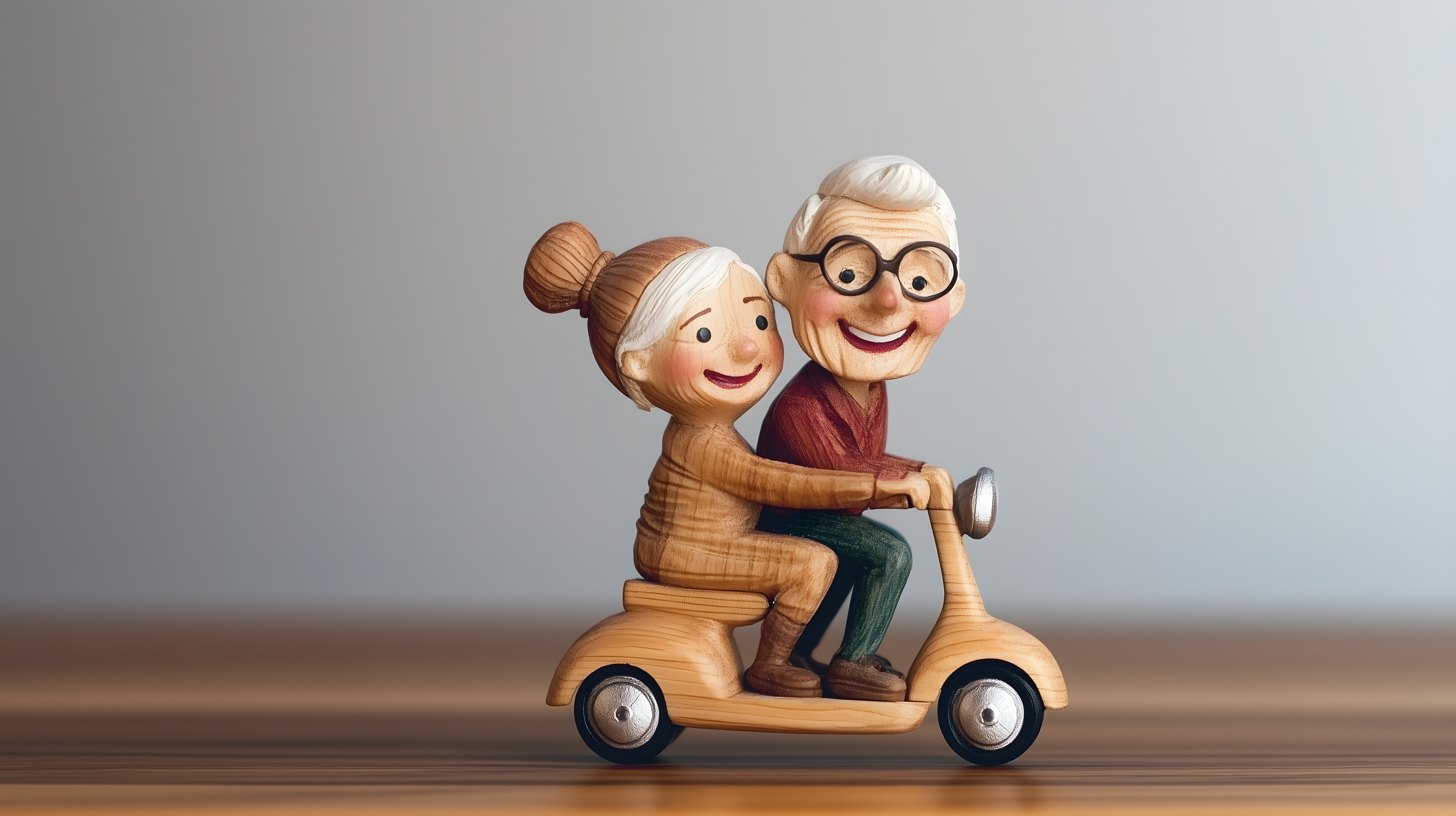 Das Bild zeigt zwei liebevoll gestaltete Holzfiguren, die einen älteren Mann und eine ältere Frau darstellen. Sie sitzen gemeinsam auf einem kleinen, hölzernen Motorroller und wirken fröhlich und zufrieden. Die Frau lehnt sich an den Mann, der sie liebevoll umarmt. Beide tragen eine entspannte, lächelnde Mimik und stellen ein glückliches Seniorenpaar dar, das seinen Ruhestand gemeinsam genießt.