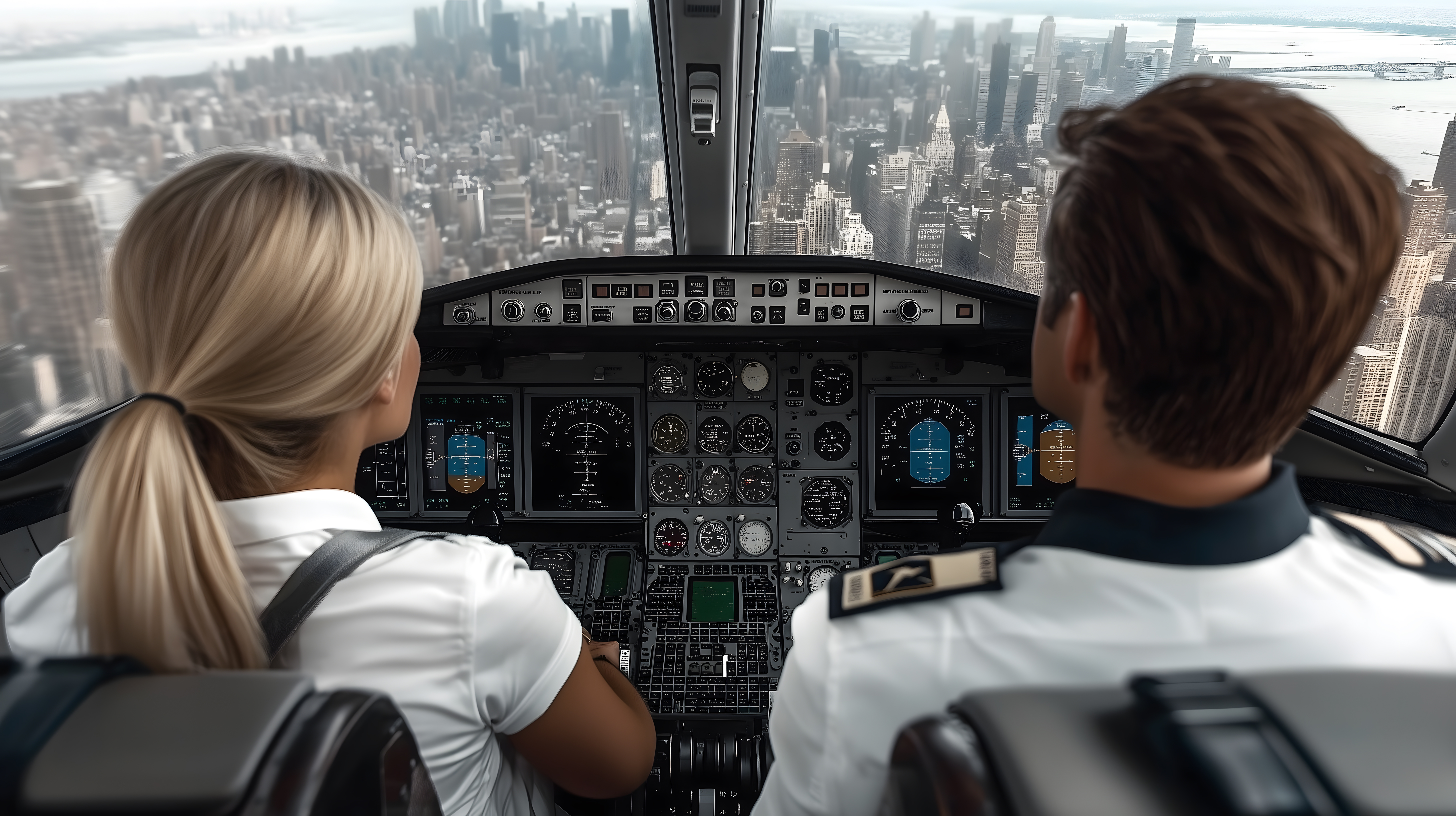Das Foto zeigt das Cockpit eines Flugzeugs mit zwei Piloten, die auf eine beeindruckende Skyline von New York City blicken. Durch die großen Fenster ist die Sicht auf die Wolkenkratzer und Hochhäuser der Metropole zu sehen. Die Cockpitinstrumente und Armaturen dominieren den Vordergrund, was den professionellen Charakter der Situation unterstreicht. Dieses hochaufgelöste Stockfoto eignet sich hervorragend für Blogs, Websites oder Werbematerial rund um Themen wie Luftfahrt, Reisen, Mobilität oder Führungskompetenzen. Als kostenloses Bild unter Creative-Commons-Lizenz kann es frei verwendet werden.