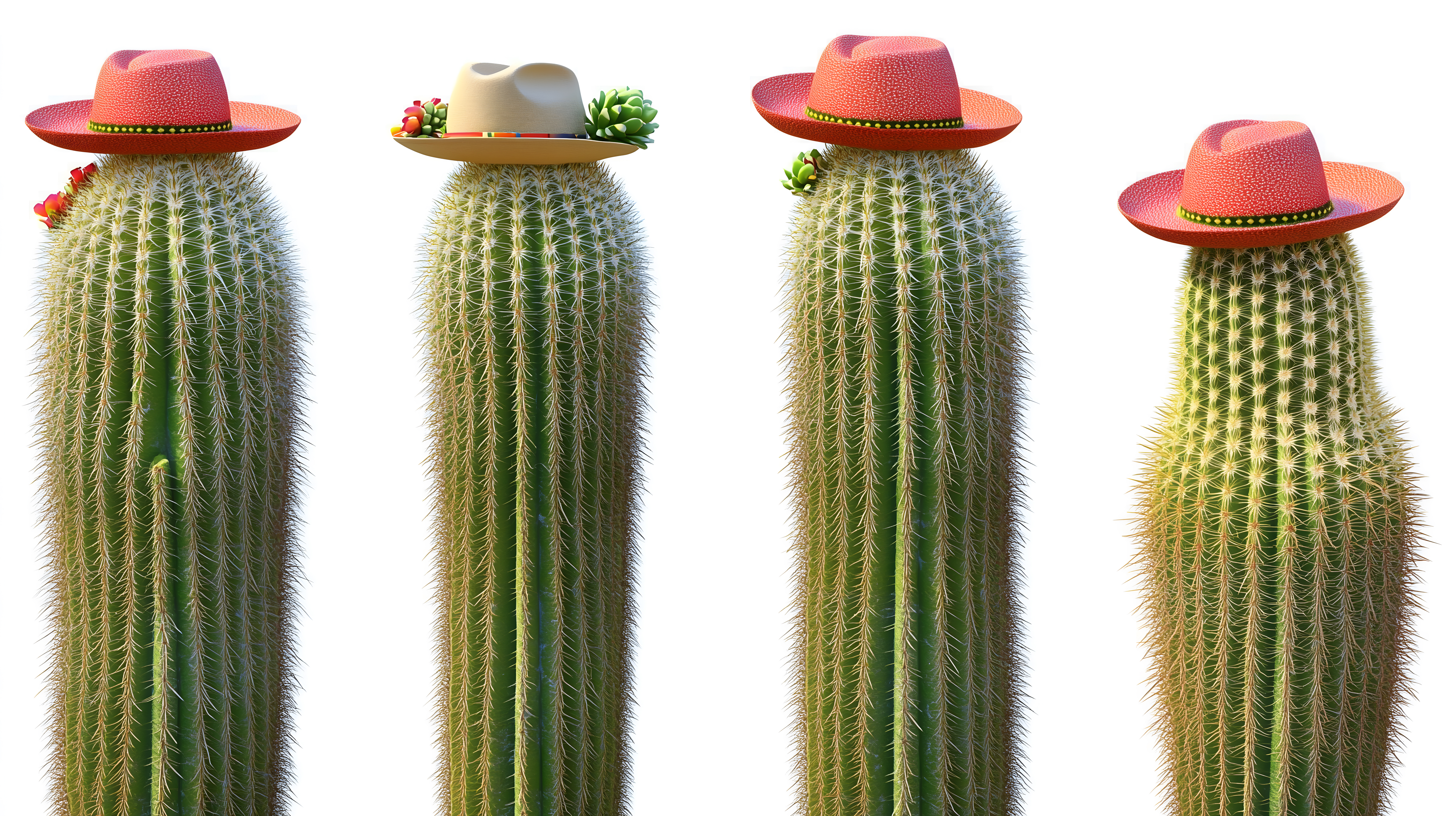 Dieses innovative und verspielt-humorvolle Foto zeigt vier Kaktus-Figuren, die mit bunten Sombrero-Hüten geschmückt sind. Die Kakteen in verschiedenen Größen und Formen stehen vor einem weißen Hintergrund, der den Fokus ganz auf die außergewöhnliche Komposition lenkt. Die grünen, säulenförmigen Pflanzenkörper kontrastieren wirkungsvoll mit den leuchtend roten Hüten, die ihnen eine menschliche Note verleihen. Dieses kreative Konzeptfoto eignet sich hervorragend für den Einsatz in Blogs, Newslettern, auf Social-Media-Kanälen oder in Werbekampagnen mit einem mexikanischen, tropischen oder surrealen Thema. Als hochwertiges, kostenloses Stockfoto unter der Creative-Commons-Lizenz kann es vielseitig und rechtssicher genutzt werden.