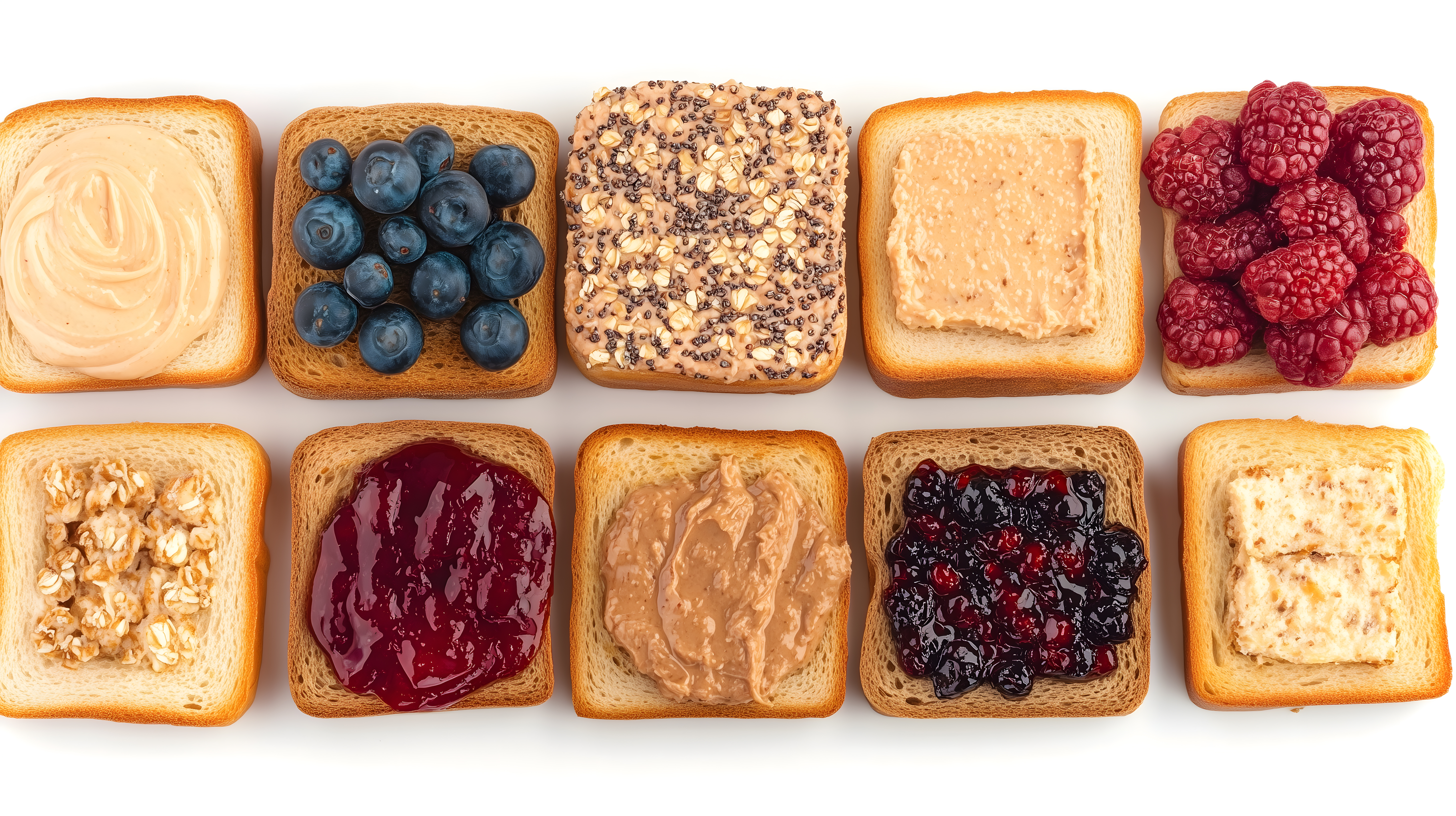 Dieses farbenprächtige Foto zeigt eine Vielzahl an Toast-Scheiben, die mit verschiedensten Aufstrichen und Zutaten belegt sind. Im Mittelpunkt stehen Toastscheiben, die mit Erdnussbutter, Marmelade, Blaubeeren, Himbeeren und anderen leckeren Toppings versehen sind. Die Anordnung in Reih und Glied verleiht dem Bild eine appetitliche, geordnete Optik. Die Kombination aus Weiß, Orange, Rot und Blau schafft einen frischen, fröhlichen Gesamteindruck. Dieses hochauflösende Foto eignet sich hervorragend als Titelbild für Rezeptsammlungen, Kochbücher oder Artikel rund um gesunde Ernährung und leckere Frühstücksideen. Als kostenloses Stockfoto unter Creative Commons-Lizenz ist es vielseitig einsetzbar, etwa für Blogs, Social-Media-Posts oder Werbematerialien.