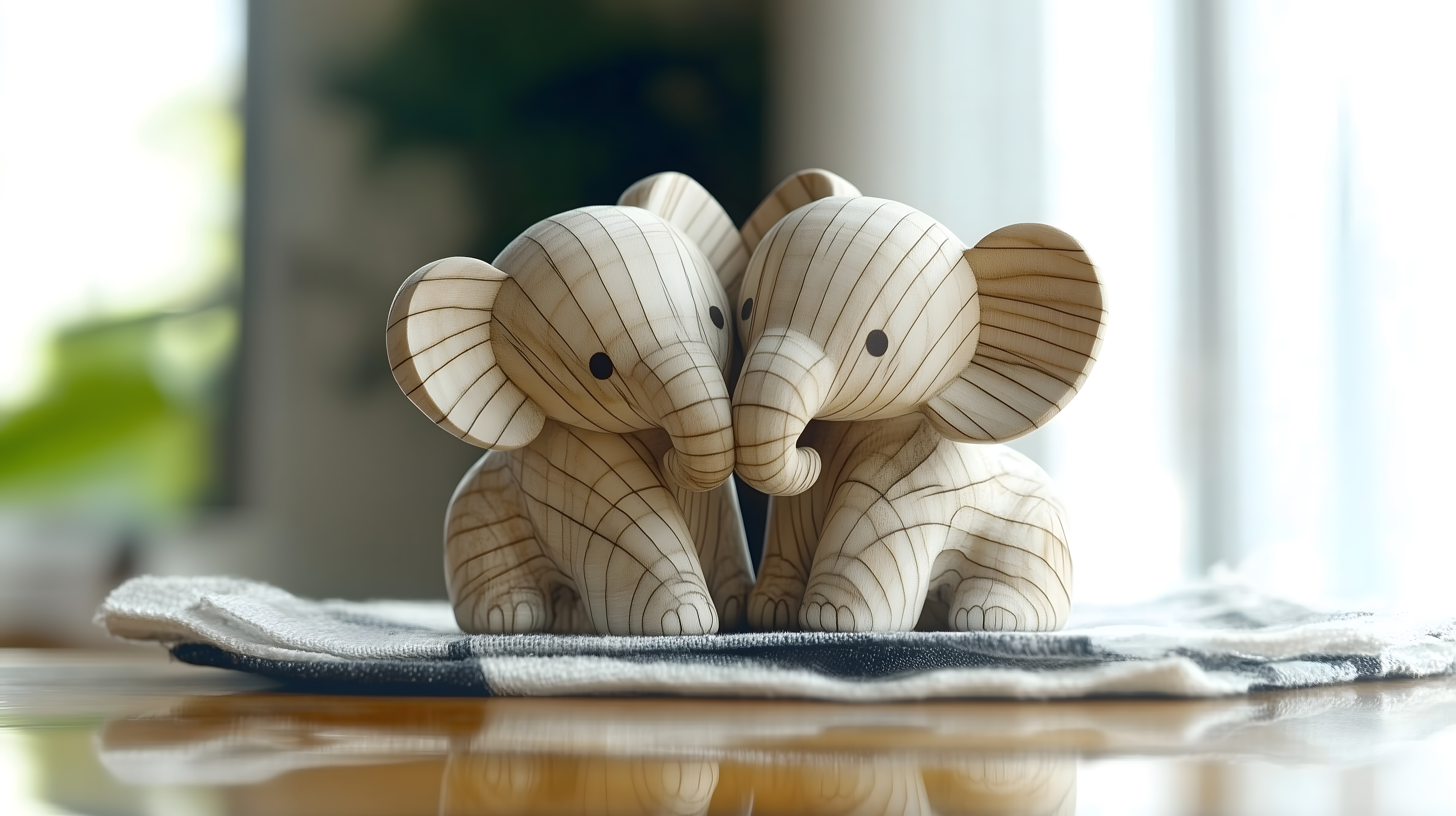 Dieses ruhige und liebevolle Bild zeigt zwei niedliche Holzfiguren von Elefanten, die eng beieinander sitzen und sich in einer zärtlichen Geste berühren. Die Elefanten sind in einem hellen, gestreiften Muster gestaltet und stehen auf einem grauen, glänzenden Untergrund, der eine spiegelnde Oberfläche erzeugt. Die Szene strahlt Ruhe, Harmonie und eine romantische Stimmung aus, die sich hervorragend für den Einsatz in Blogs, Newslettern, sozialen Medien oder für Werbezwecke eignet. Dieses hochauflösende und kostenfrei lizenzierte Stockfoto in natürlichen Farben ist ein vielseitig einsetzbares Gestaltungselement.
