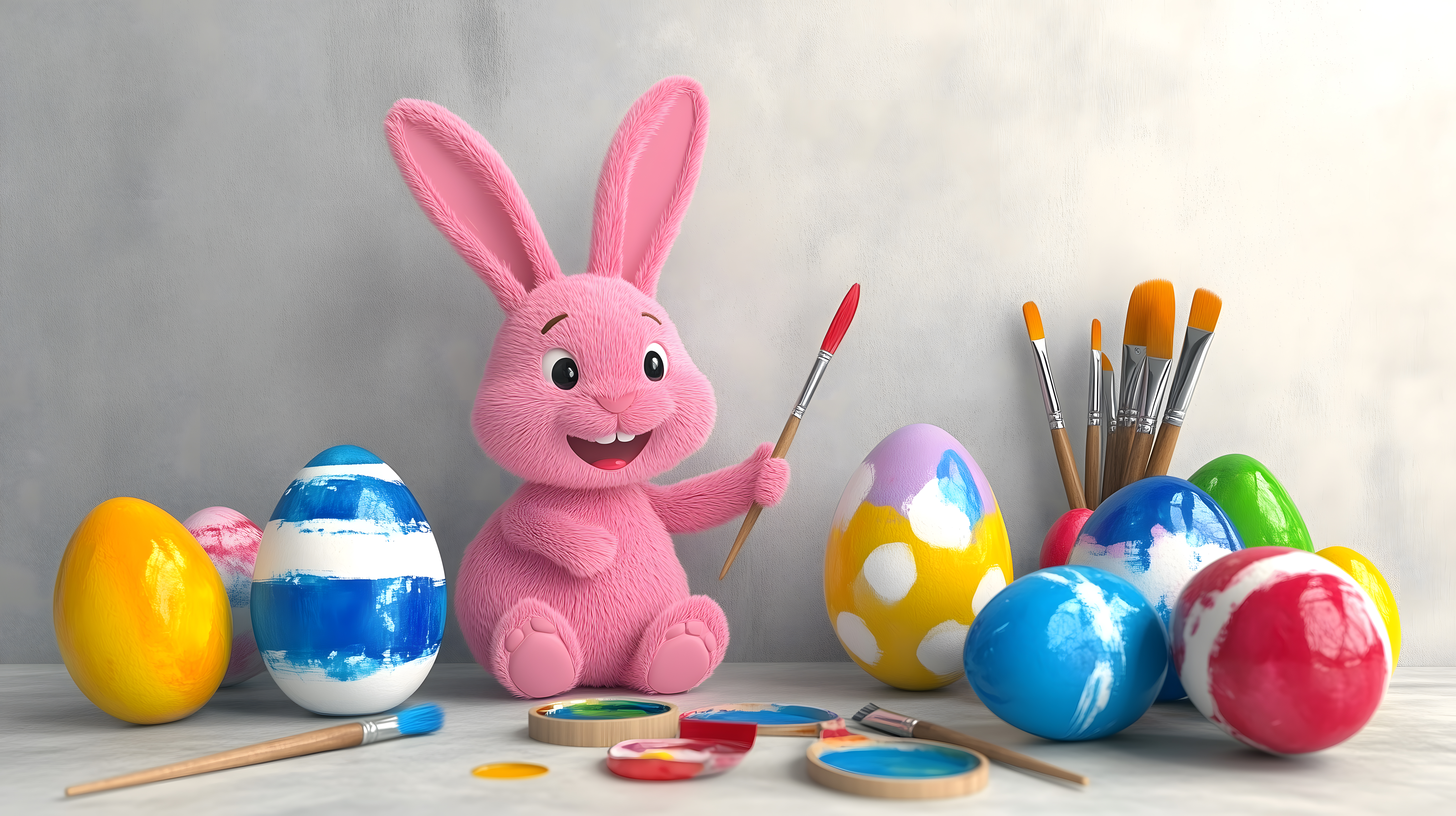 Das Bild zeigt einen niedlichen, rosafarbenen Plüschhasen, der zusammen mit bunten, bemalten Ostereier und verschiedenen Malmaterialien wie Pinsel und Acrylfarben auf einem hellen Holzboden platziert ist. Der Hase hält einen Pinsel in der Hand, als würde er selbst an den Eiern malen. Die Komposition ist fröhlich und farbenfroh, was perfekt zur österlichen Stimmung passt. Dieses Stockfoto eignet sich hervorragend für den Einsatz in Osterdekorationen, Einladungen, Blogbeiträgen oder Werbekampagnen rund um das Thema Ostern. Es ist in hoher Auflösung und unter einer Creative-Commons-Lizenz verfügbar, sodass es kostenfrei und vielseitig genutzt werden kann.