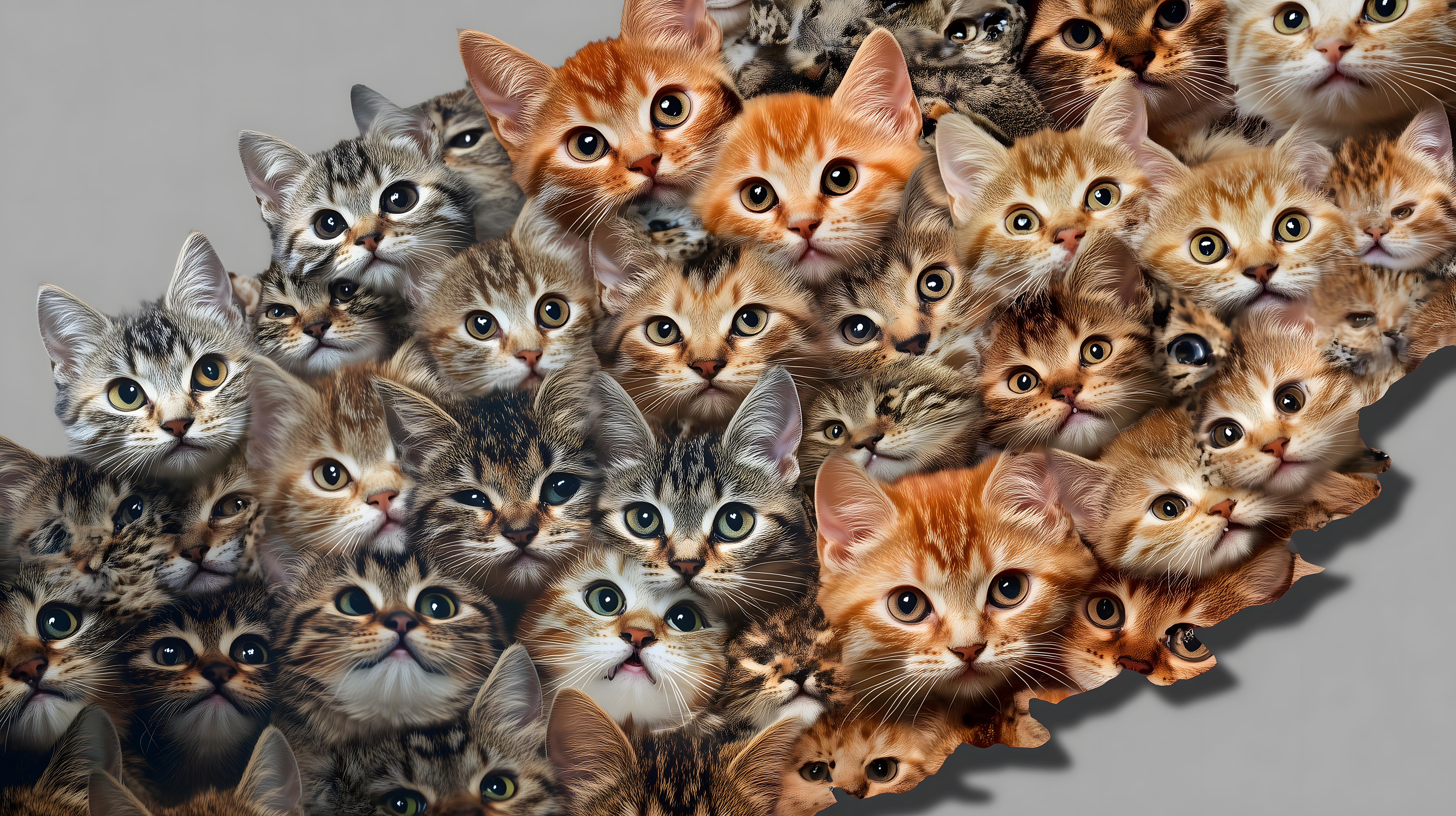 Das Foto zeigt eine Ansammlung von überaus niedlichen Katzenbabys, die allesamt in die Kamera blicken. Die kleinen Fellknäuel sind in unterschiedlichen Farben und Mustern abgebildet, vom kräftigen Orange bis hin zu getigerten Grautönen. Die Kätzchen sind in einem Fotostudio vor einem neutralen Hintergrund positioniert und schauen mit großen, neugierigen Augen in die Kamera. Dieses charmante Katzenchor-Foto eignet sich hervorragend als kostenloses Stockfoto für Blog-Beiträge, Newsletter, Social-Media-Kanäle oder Werbematerialien rund um das Thema Haustiere, Tierwelt und Familienleben. Die hochwertige Auflösung und Creative-Commons-Lizenz ermöglichen eine flexible Nutzung.