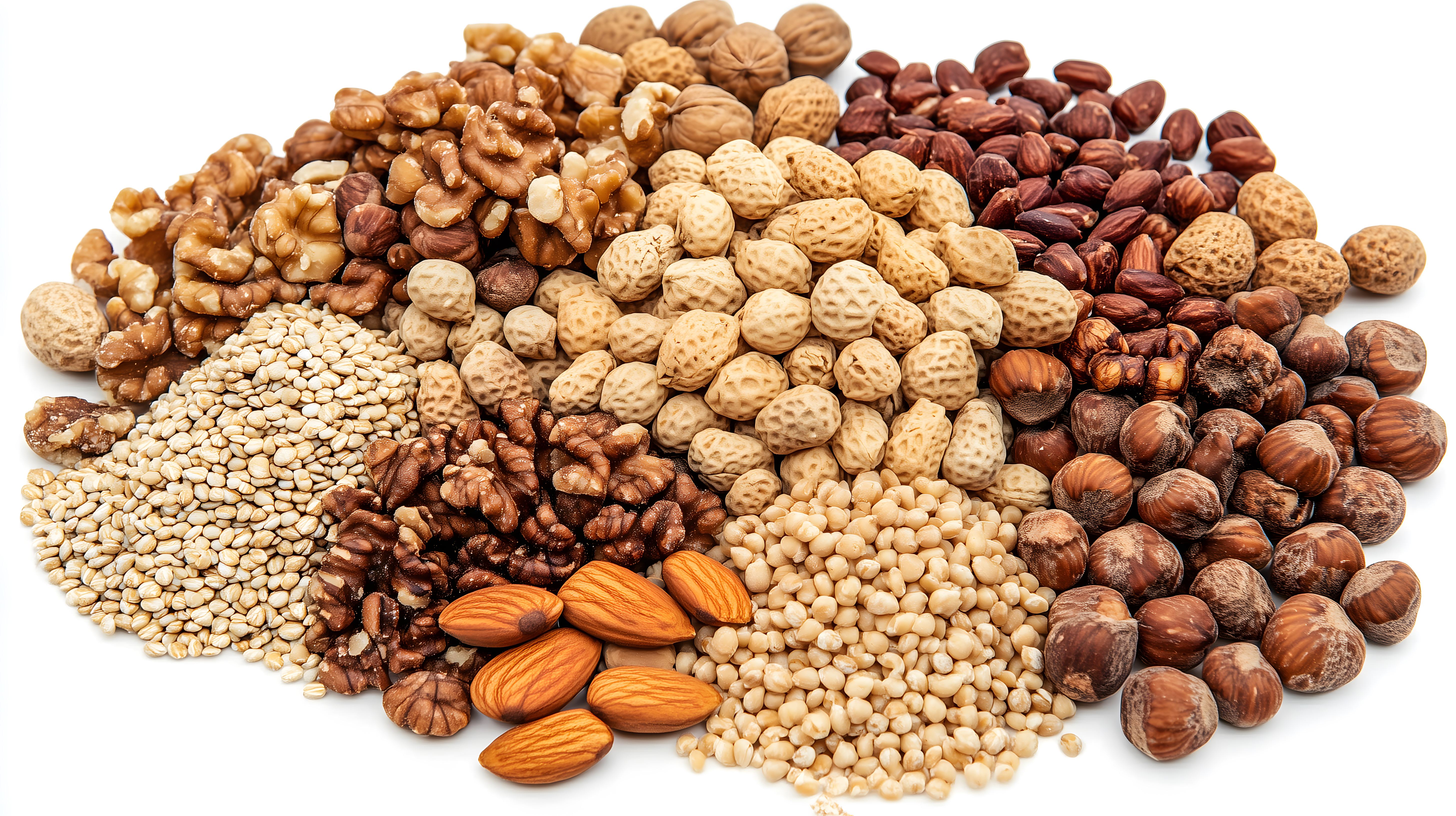 Dieses Foto zeigt eine bunte Auswahl an verschiedenen Nüssen und Samen wie Walnüsse, Mandeln, Erdnüsse, Haselnüsse, Leinsamen und Quinoa. Die Nüsse und Samen sind auf einer weißen Oberfläche angeordnet, was einen schlichten und minimalistischen Hintergrund bietet, um die natürlichen Farben und Strukturen der Lebensmittel optimal zur Geltung zu bringen. Dieses hochaufgelöste Stockfoto eignet sich perfekt für die Verwendung in Blogs, Newslettern, auf Social-Media-Kanälen oder in Werbekampagnen zum Thema gesunde Ernährung, Fitness und Nachhaltigkeit. Es steht unter der Creative-Commons-Lizenz zur kostenlosen Nutzung zur Verfügung.